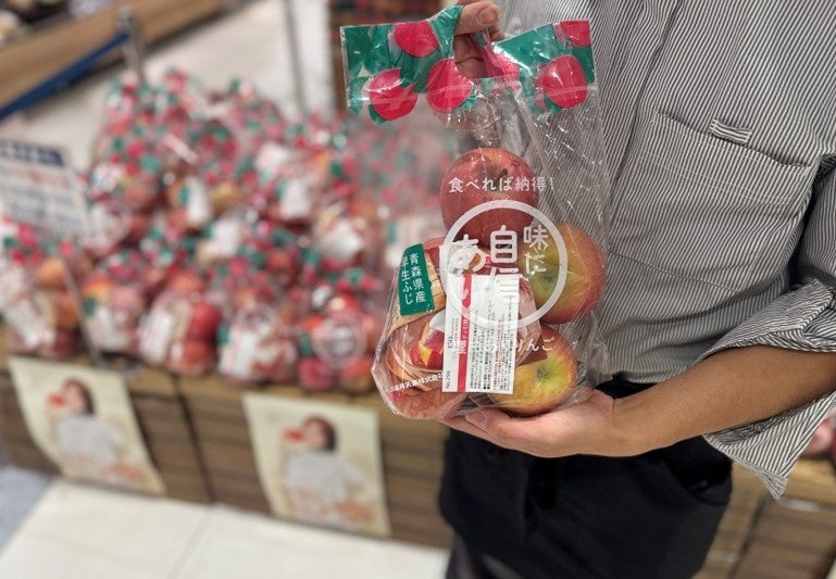 イベント会場となったイオンモール幕張新都心店の青果売り場では、イベント開催を記念し、朝8時より300個限定でノベルティ付きの青森りんごが販売されました。今回販売されたのは、今年収穫されたばかりで、蜜が多く糖度が高いと評判の「早生ふじ」。当日は「早生ふじ」を求めて多くの方が訪れ、青果売り場は盛況となりました。