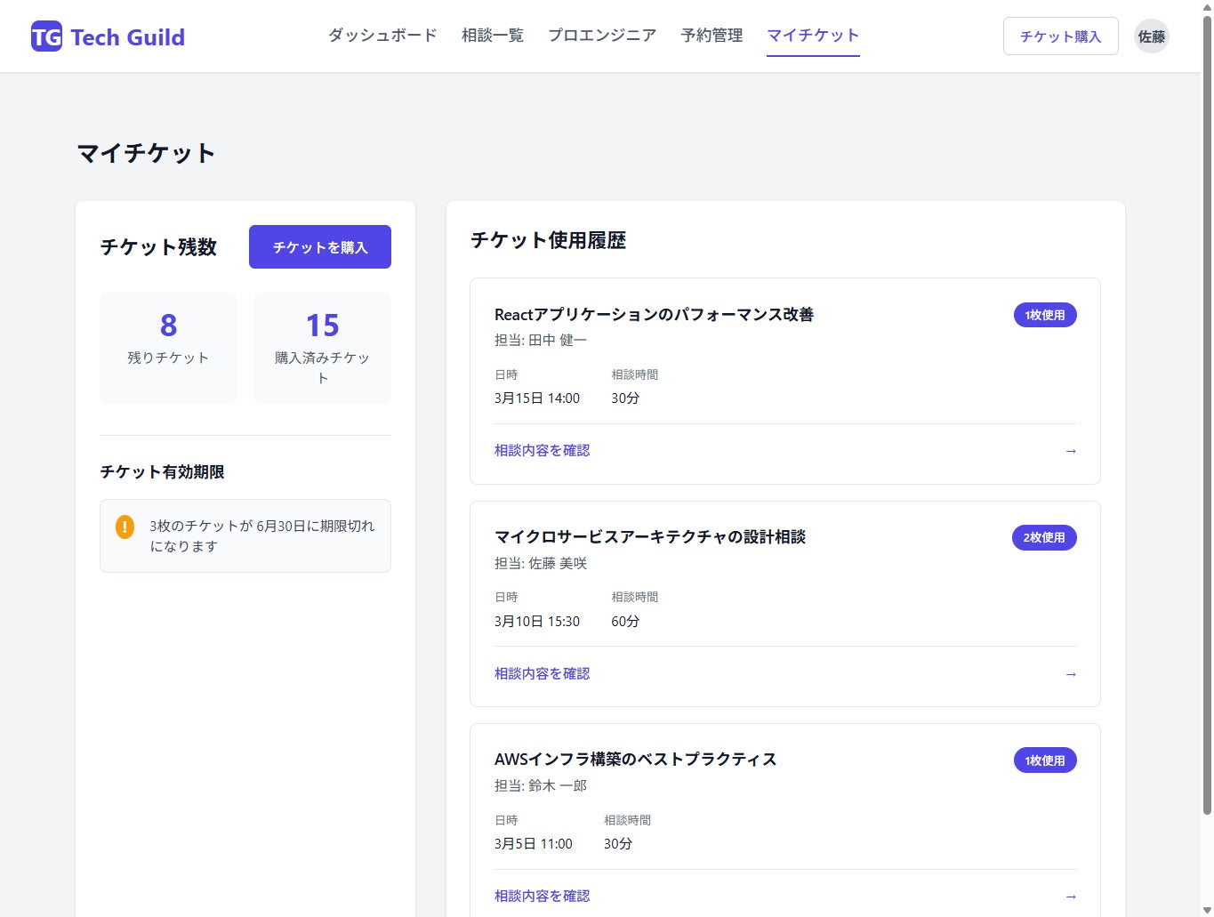 ここでは、プロエンジニアは自らの経験や知見を話す時間を1チケットとして、本気で相談したいジュニアエンジニアに向けて「販売する」ことができ、ジュニアエンジニアは技術相談やキャリア相談をしたいメンターを選び、そのチケットを「購入する」ことができます。プロエンジニア同士でも、チケットの購入や相談ができます。