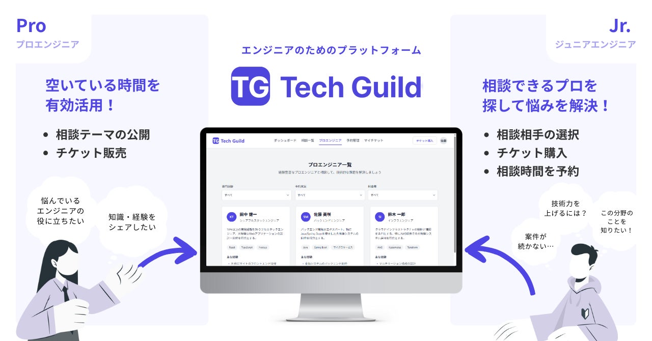 今回は、様々な立場のエンジニア同士が互いの知見を持ち寄る場を作ることで、情報交換を促進できる機会を増やしていきたいという思いから、最初のサービスとして『Tech Guild』をリリースすることといたしました。『Tech Guild』の公開によって、自らの知識や経験・時間を活用したいシニアなプロエンジニアにとっても、悩みを持つジュニア・中堅のエンジニアにとっても、良い出会いや解決策を見つけられるような場を提供できればと考えています。