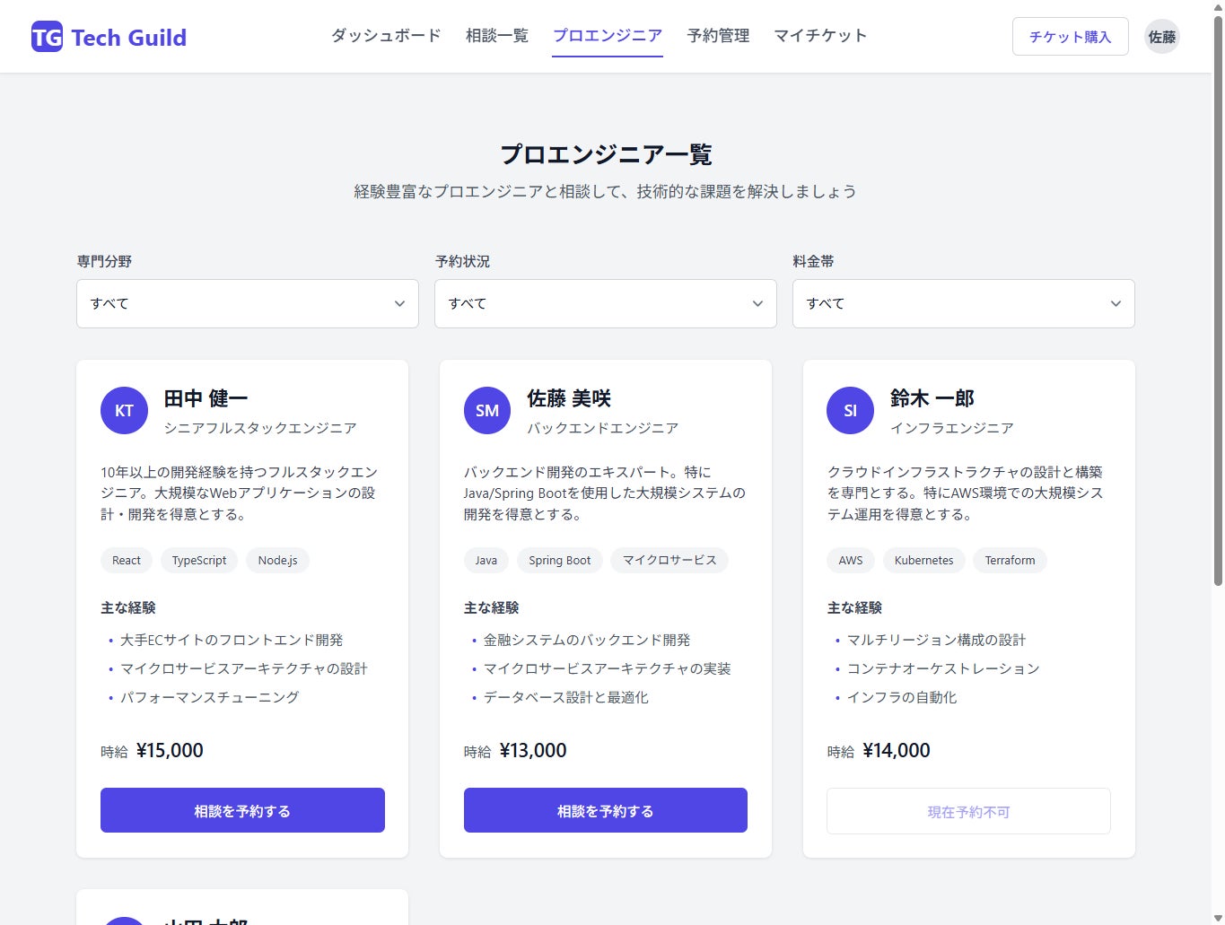 プロエンジニアは、蓄積した技術・開発ノウハウを収益化し、次世代のプロフェッショナル育成に貢献できます。Tech Guildを利用することにより、煩雑な手続きやトラブル対応の心配なく、スムーズに技術相談サービスを提供することが可能です。(プロエンジニアも、他のエンジニアのチケットを購入できます)
