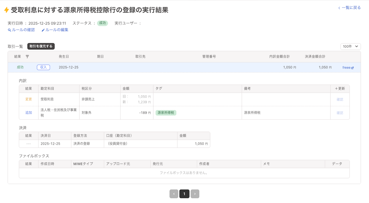 最大の強みとして、自動登録ルールではカバーできない領域の取引変更、設定した条件に基づく取引変更を、日次や月次などのスケジュールに合わせて「自動実行」させることができます。毎月発生する決まったパターンの修正作業をシステムに任せることで、経理担当者は高頻度で発生する取引の修正などをシステムに任せることが可能になり、処理履歴からビフォーアフターを「確認するだけ」の状態となり、真の自動化を実現します。