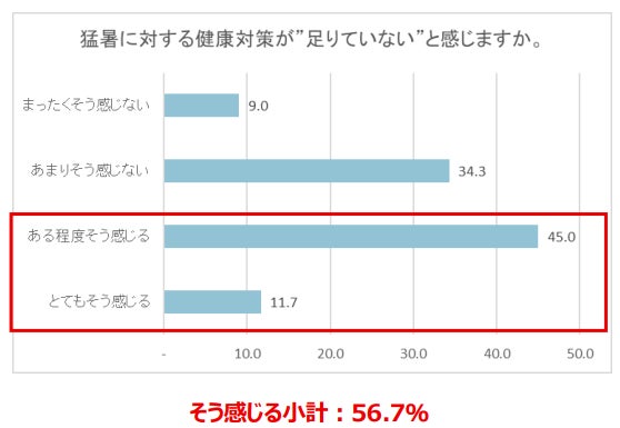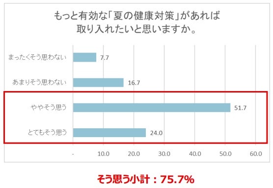■「猛暑に対する健康対策が足りていない」は56.7%、「より有効な夏の健康対策があれば取り入れたい」は75.7%が「そう思う」と回答