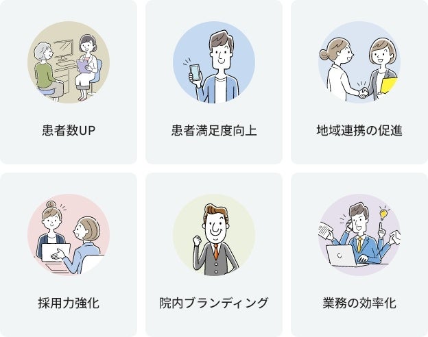 病院のWEBサービスは、病院が抱えるさまざまな「悩み」を解決し、選ばれ、信頼される病院の未来をともに創っていくサービスです。