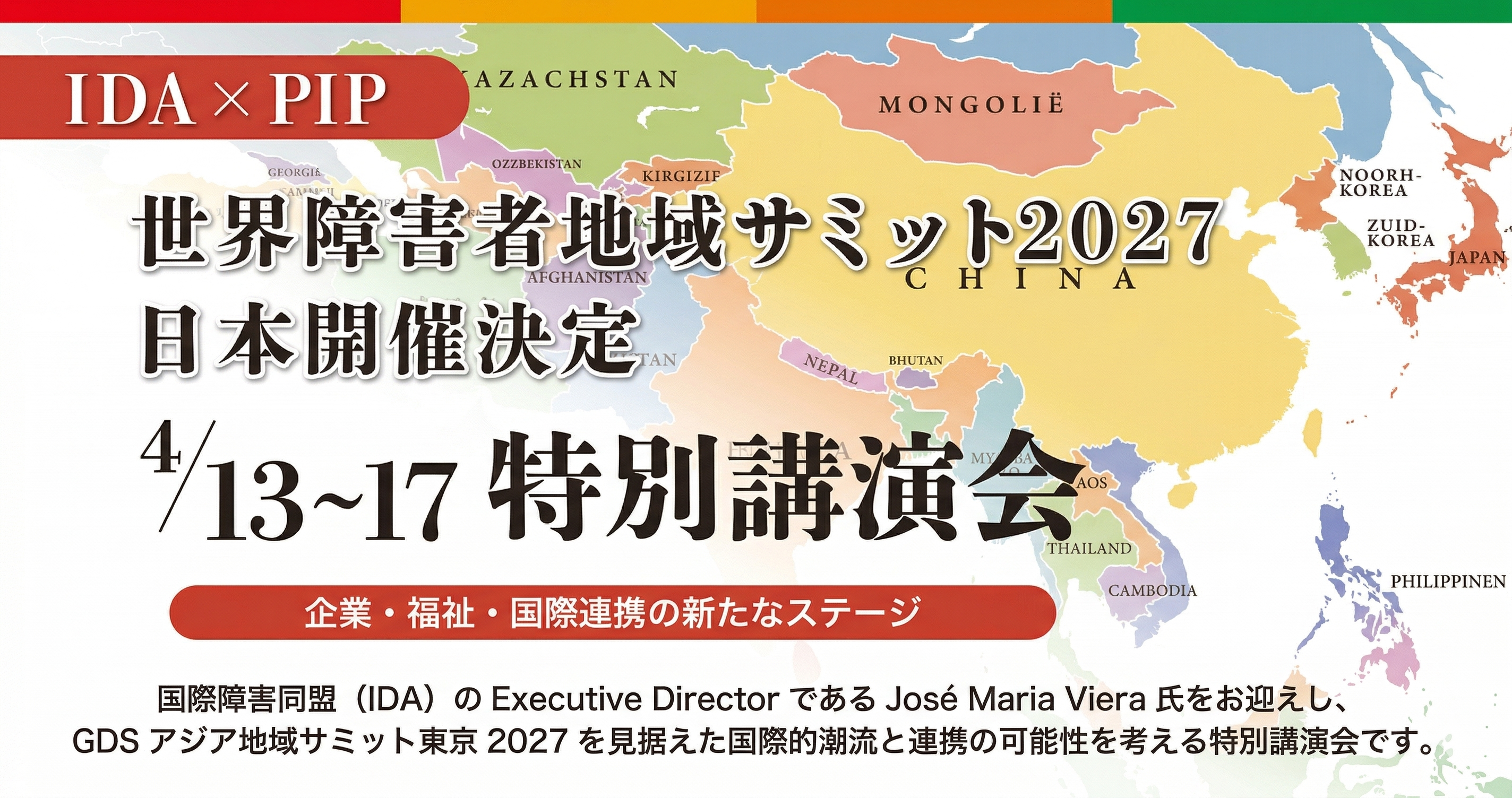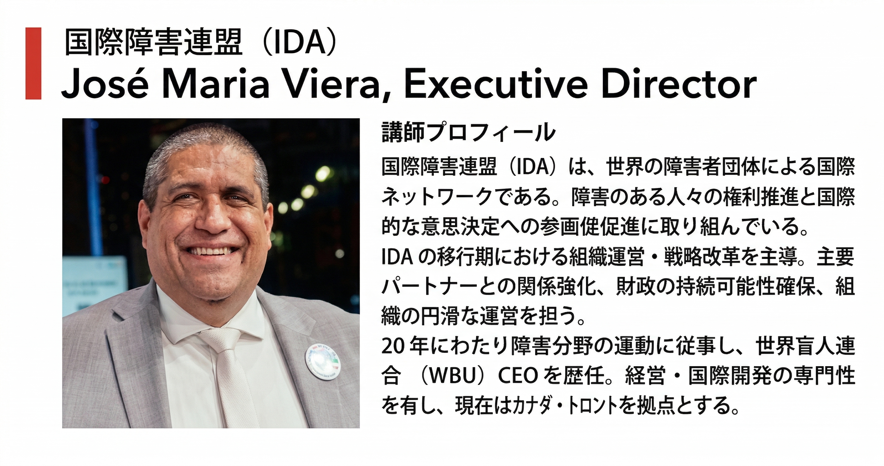 IDAのエグゼクティブ・ディレクターであるJosé Maria Viera氏を招き、2027年に日本で開催が決定した「世界障害者地域サミット(Global Disability Summit アジア地域版)」を見据えた国際的潮流と、企業・福祉・市民社会が果たすべき役割について議論します。