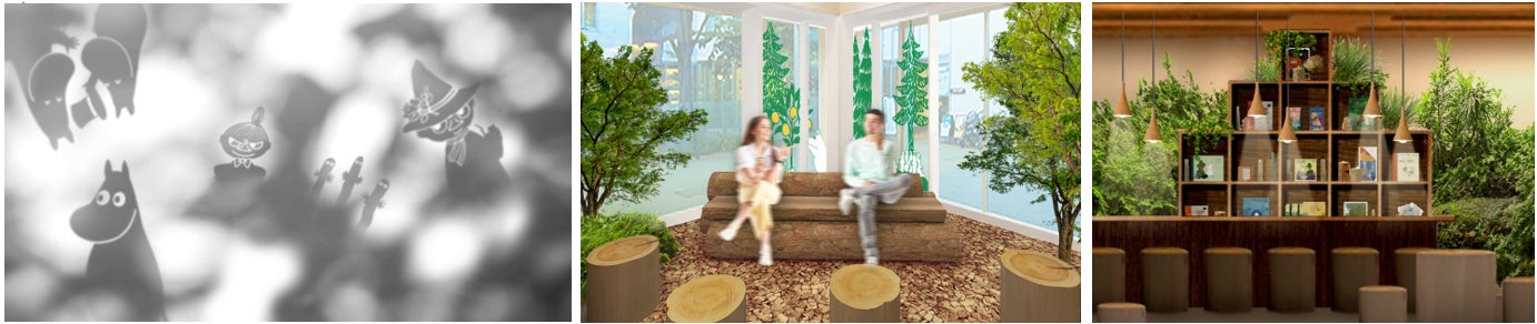 森を思わせる木漏れ日のなか、ムーミンやそのなかまたちが木陰から見え隠れするアートと共に、ゆったりとした雰囲気を演出しています。王子の森で育ったドングリの木で作った樹皮の質感ある丸太ベンチや、森をテーマにした書籍が並ぶ森の本棚など、森を感じる空間でくつろぎの時間をお過ごしいただけます。