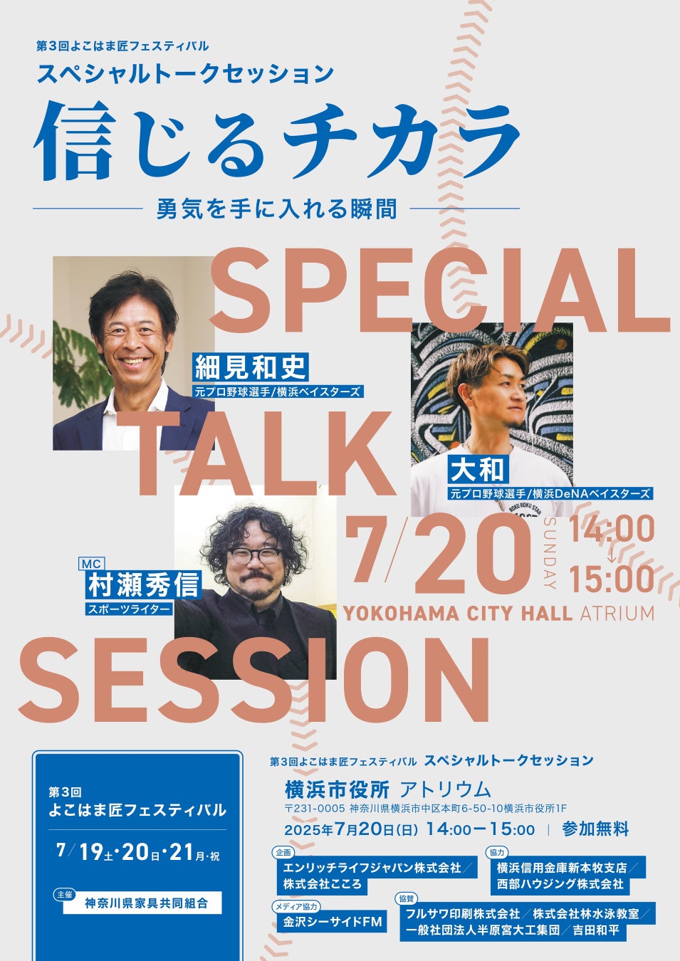 7/20(日)、横浜市役所アトリウムにて開催される「第3回よこはま匠フェスティバル」(主催:神奈川県家具協同組合・後援:横浜市)にて、元横浜ベイスターズ投手である細見和史氏がトークショー『信じるチカラ~勇気を手に入れる瞬間~』に登壇する。同フェスティバルは、匠の技とこころの次世代への継承を目的に県下の家具職人たちが開催するイベントで、夏休みの親子連れなどを対象にワークショップなどを実施。ワークショップは、予約制になっており、申し込みが必要(下記「よこはま匠フェスティバル実行員会告知サイト」を参照)、7/19~21の3日間で約3000人の来場を見込む。