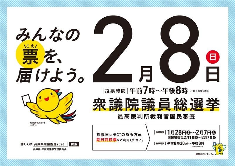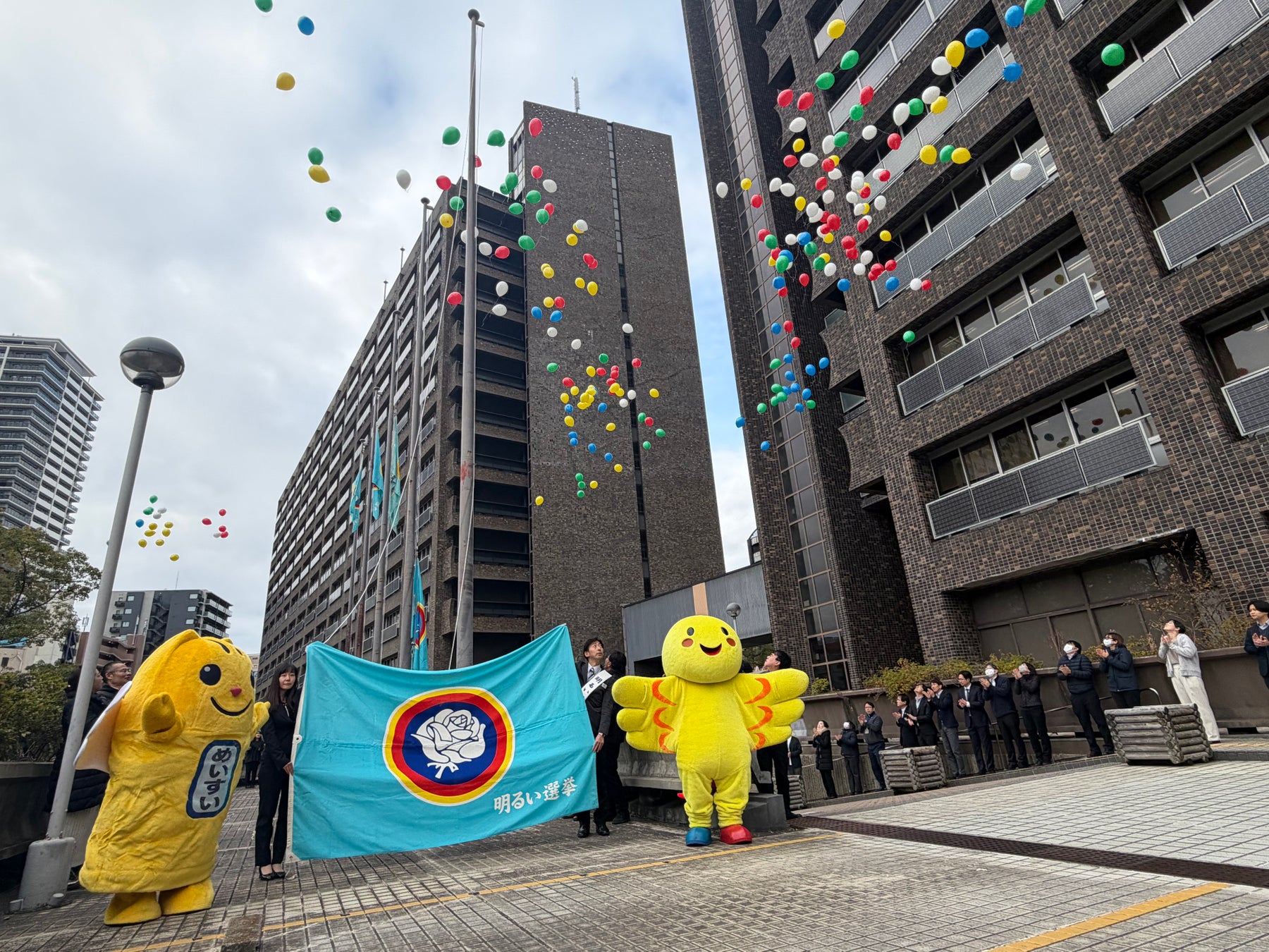 令和8年2月8日(日)に執行される衆議院議員総選挙における投票率の向上と、明るい選挙の実現に向けて、兵庫県選挙管理委員会では、1月26日(月)に兵庫県明るい選挙推進協議会会長等によるシンボル旗の掲揚式を執り行いました。また、投票日の2月8日(日)まで、兵庫県内の有権者へ向けて、様々な啓発事業を実施します。