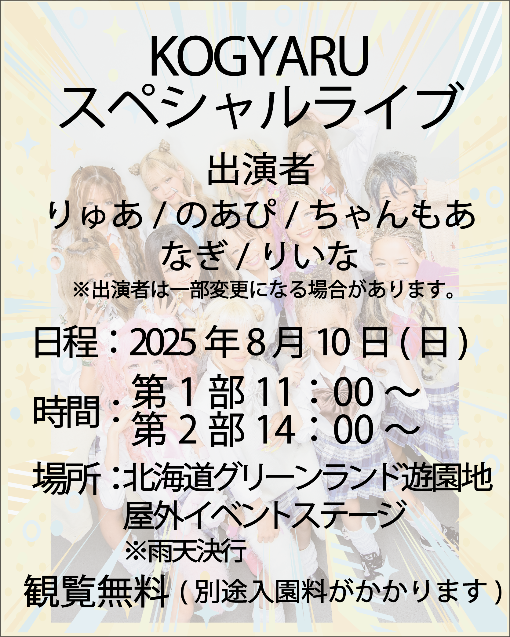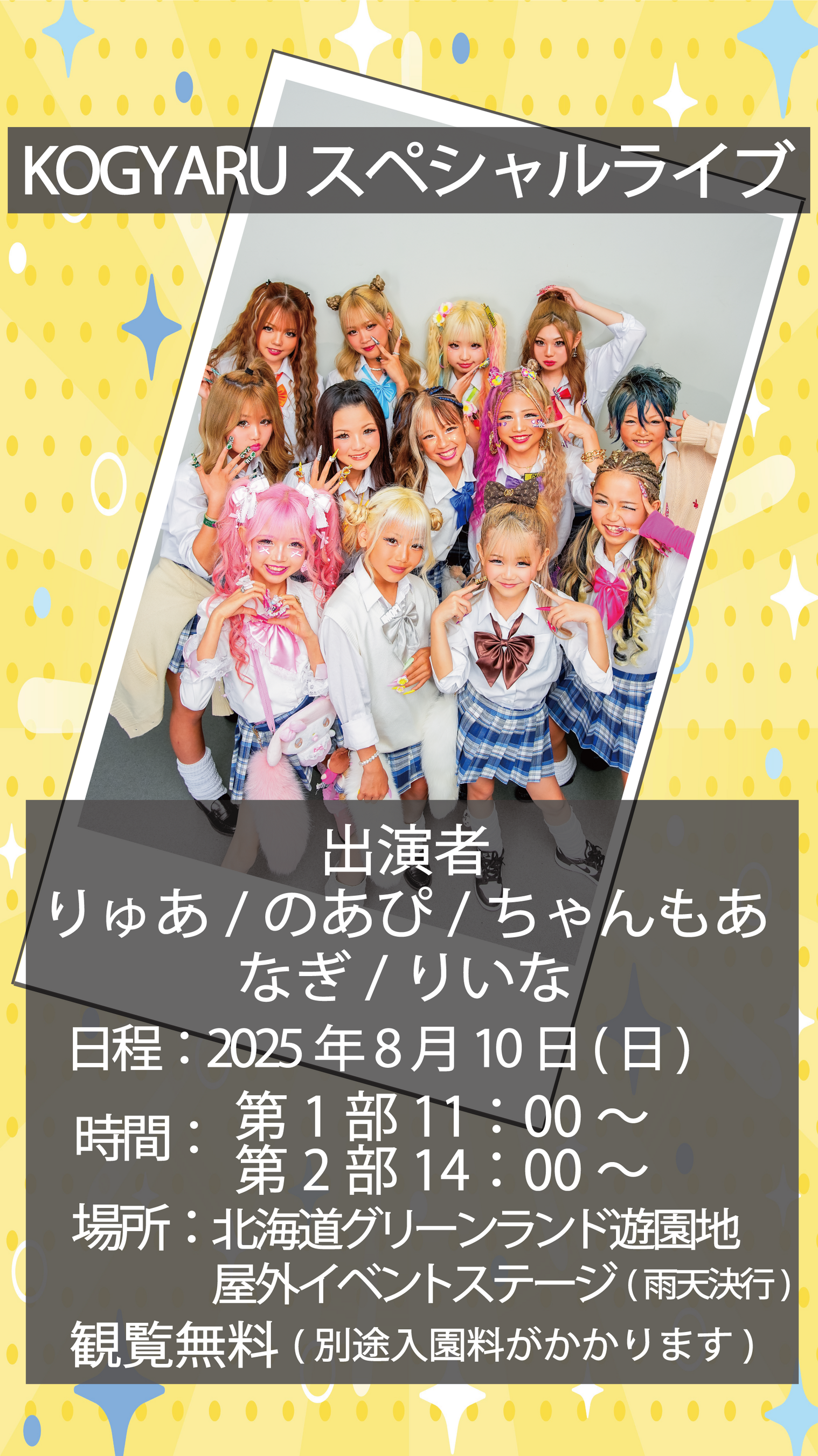 大人気「KOGYARU」のスペシャルライブが開催されることが決定いたしました。小学生向けギャル雑誌「KOGYARU」の人気モデルたちが出演するこのライブは、8月10日(日)に北海道グリーンランドにて行われます。