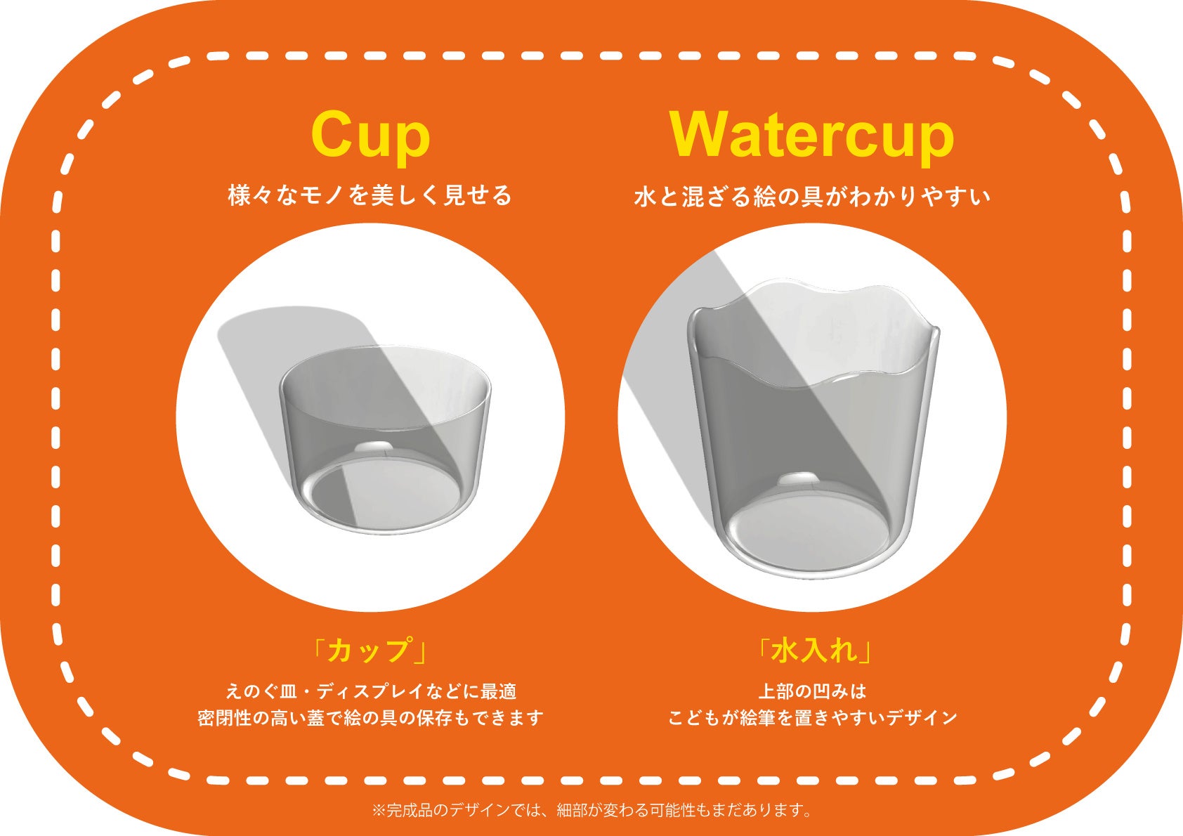 Cup:2歳児が使いやすい絵の具皿。ディスプレイ什器としても機能する。蓋付きで保存が可能。クリアな透明素材で、観察を促す。