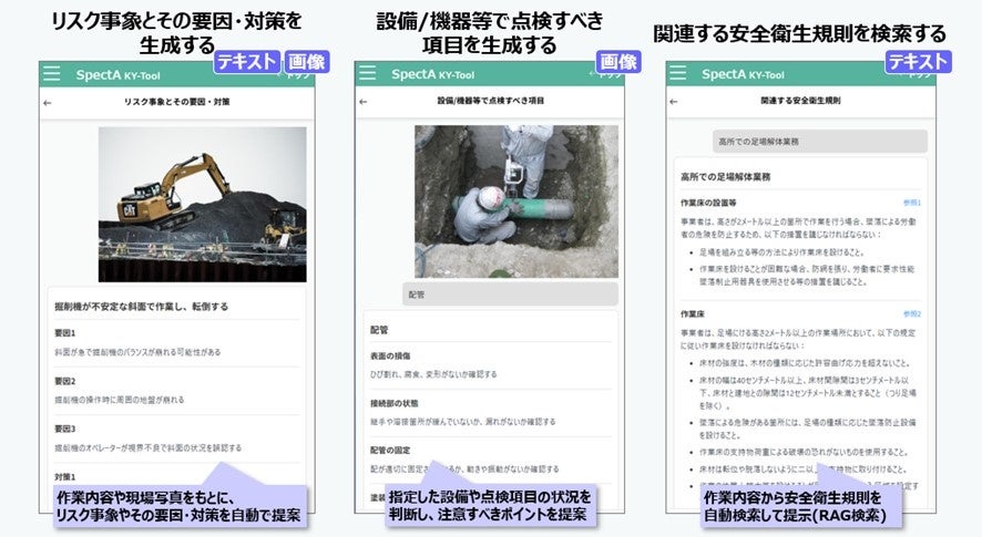 SOLIZE Ureka Technology株式会社(本社:東京都千代田区、代表取締役社長:堤 寛朗)は、施工現場における労働災害や品質トラブルの未然防止に特化した自然言語処理AIソリューション「SpectA KY-Tool(スペクタ ケーワイツール)」をアップデートし、生成AIを活用したリスク抽出および対策を提案する新機能を搭載しました。