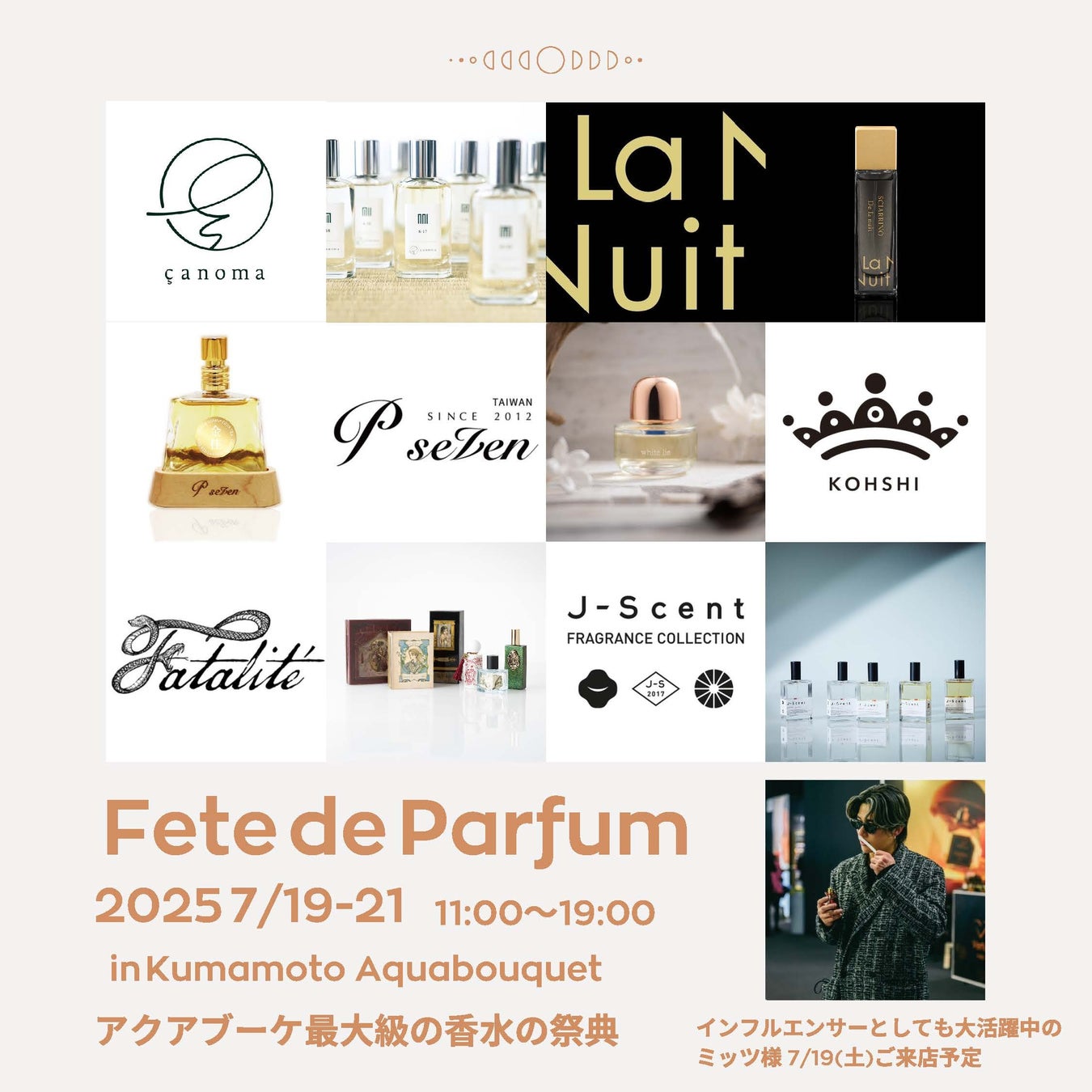 香水・化粧品の専門店「アクアブーケ」(有限会社ユーロエージェント、熊本市中央区)は、国内外の香水ブランドを集めた九州最大級の香水イベント「Fete de Parfum in Kumamoto(フェット・ドゥ・パルファン・イン・クマモト)」を、2025年7月19日(土)~21日(月・祝)の3日間、アクアブーケ店内にて開催します。