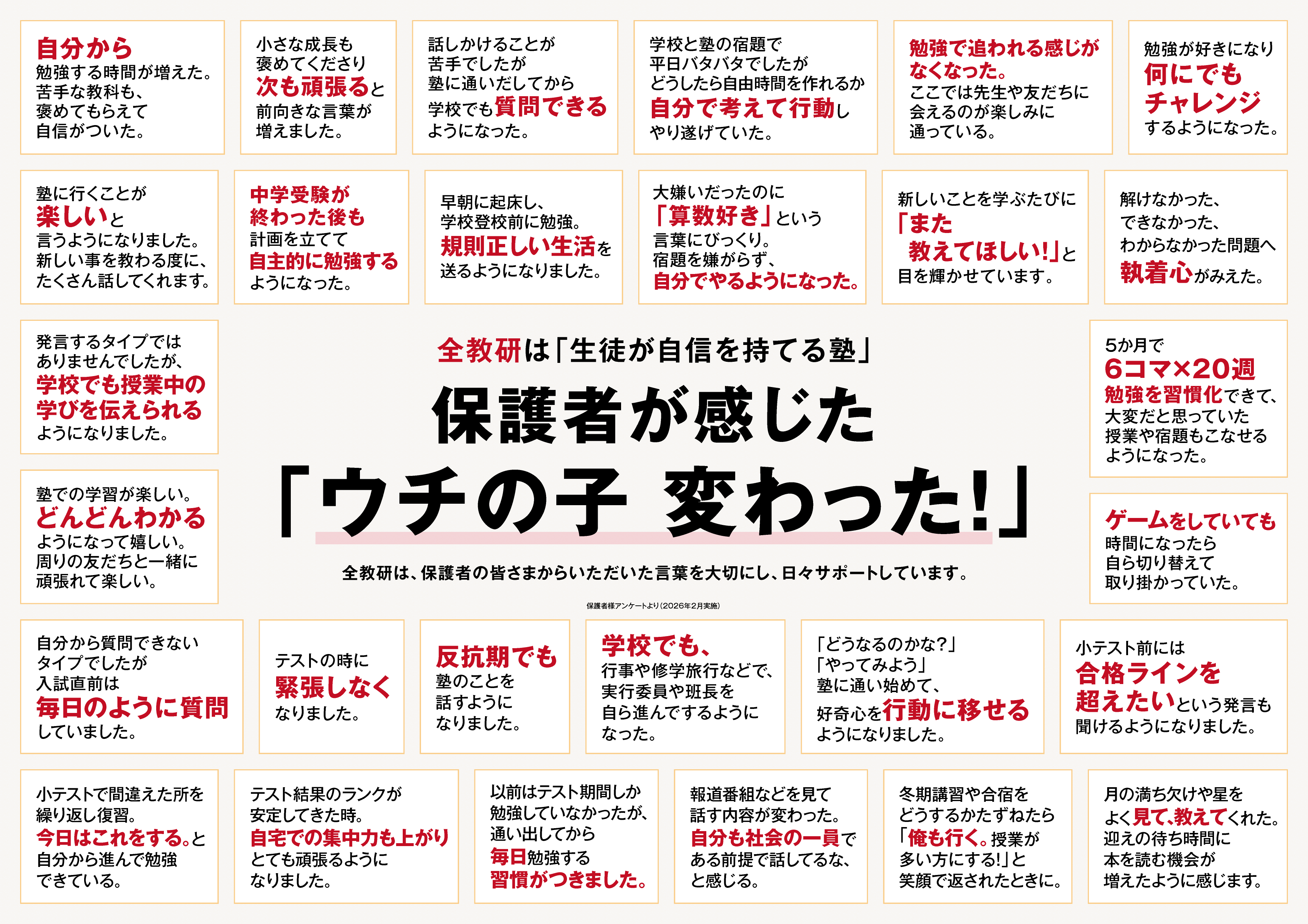 第1弾では、保護者約670名に実施した「お子さまがこれまで全教研に通われていて変わったと思われた瞬間を教えてください。」というアンケートに対して、「中学受験が終わった後も計画を立てて自主的に勉強するようになった。」や「自分から質問できないタイプでしたが、入試直前は毎日のように質問していました。」など、成績向上といった実態ではなく、生徒の自律や行動変容に対して成長を感じたという回答を多数頂きました。