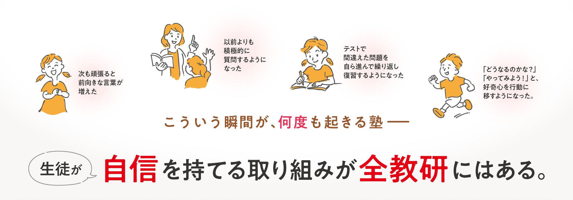 全教研では、子どもたちが自信を持つきっかけは「成績の向上」だけではないと考えています。生徒が自信を持つプロセスには、
