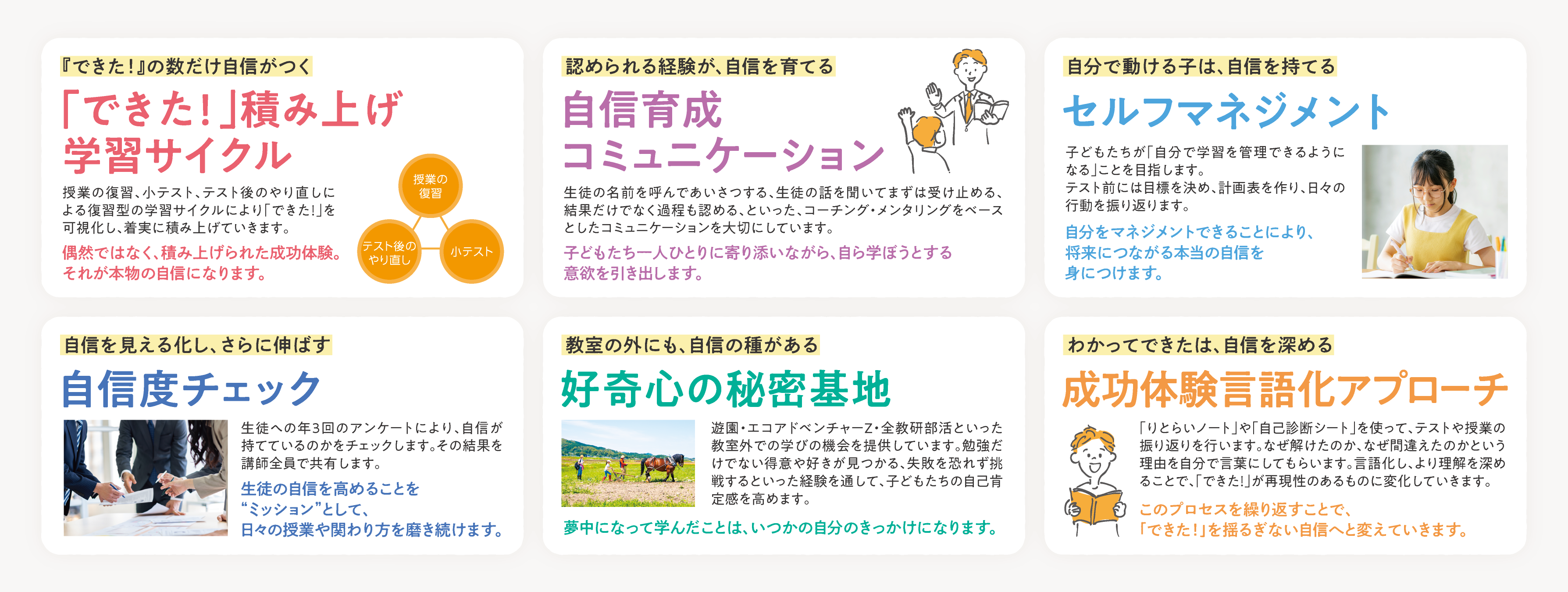こうした調査結果をもとに、全教研では生徒の自信を育てるため「6つの取り組み」を柱にサポートしています。