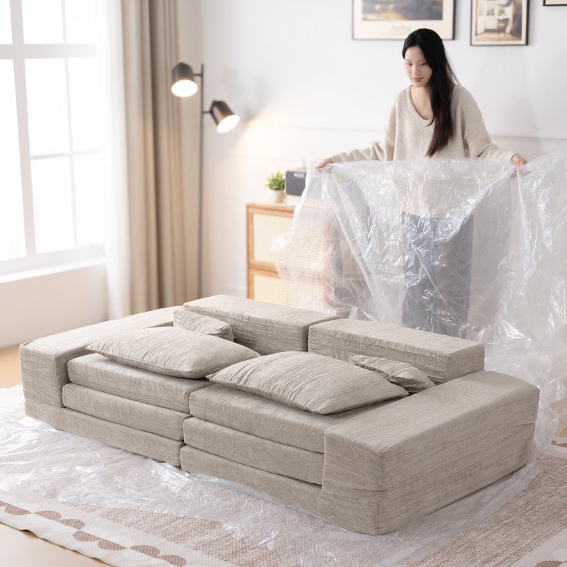 「箱を開けた瞬間はコンパクト、設置後はしっかり快適」。圧縮梱包ならではの驚きと利便性を兼ね備えた、新しいソファ体験を提供します。