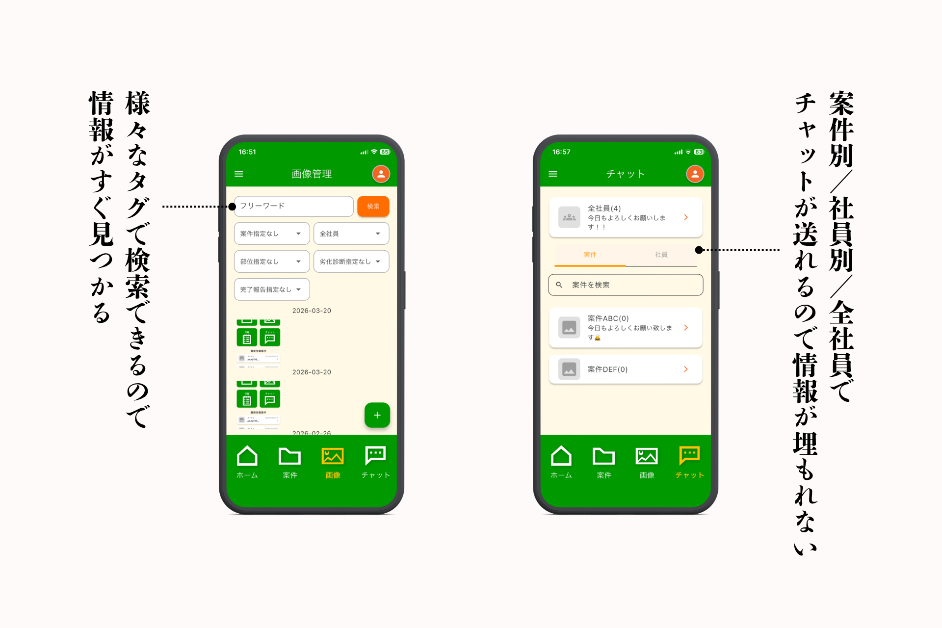 「ヌリスマ」は効率可能な事務作業を短縮化するため、案件ごとに情報を集約する「情報の箱」機能を搭載しました。チャット、写真、現場の進捗状況を一つの画面で管理することで、情報の検索や整理の手間をゼロに。情報管理と書類作成を限りなくシンプルにすることで、業界全体の生産性向上に貢献します。