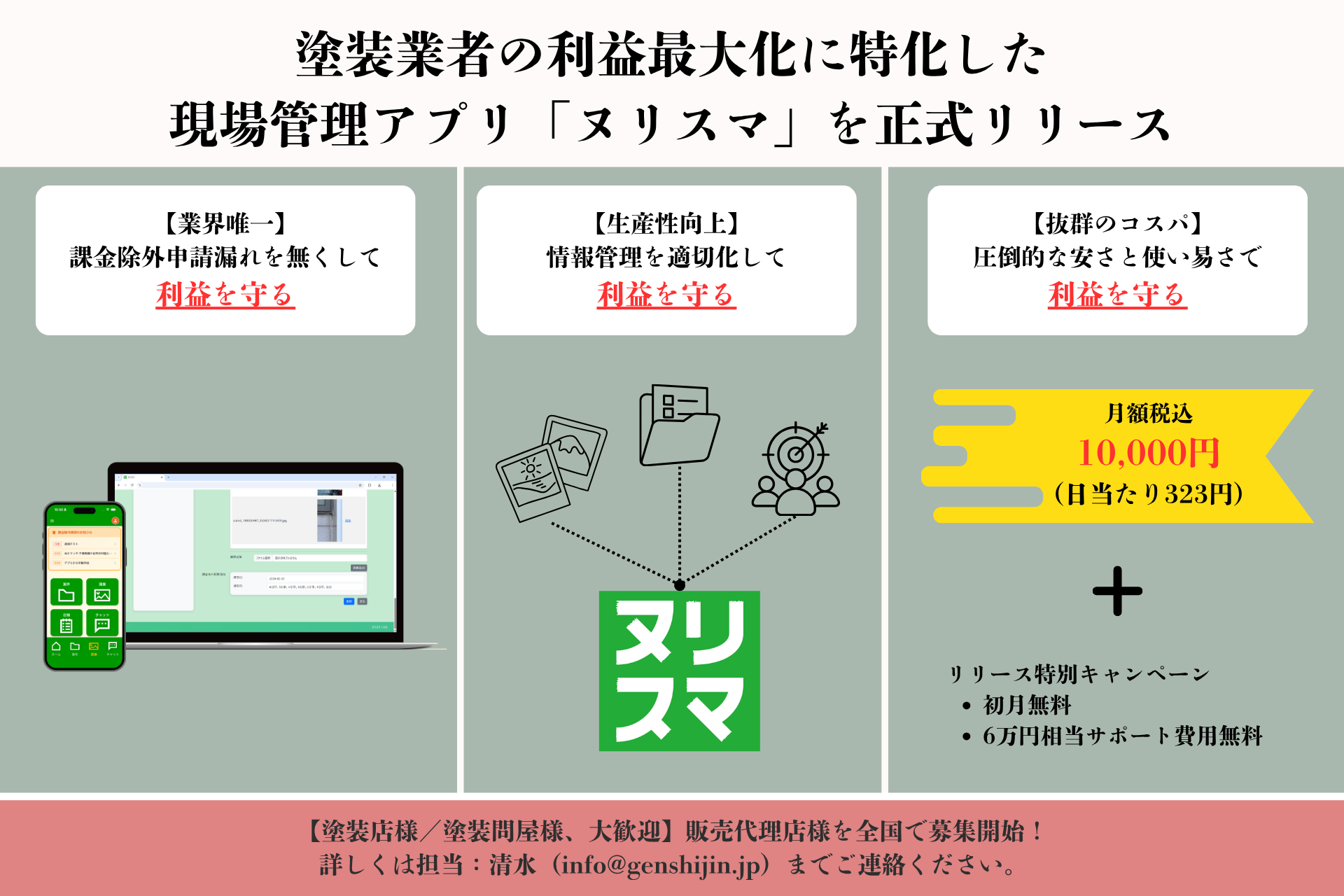 株式会社元始人(本社:群馬県高崎市)は、塗装業者の利益最大化に特化した現場管理アプリ「ヌリスマ」を正式リリースいたしました。あわせて、本サービスを共に広めていただける全国の販売代理店様を、50社限定で募集開始したことをお知らせします。