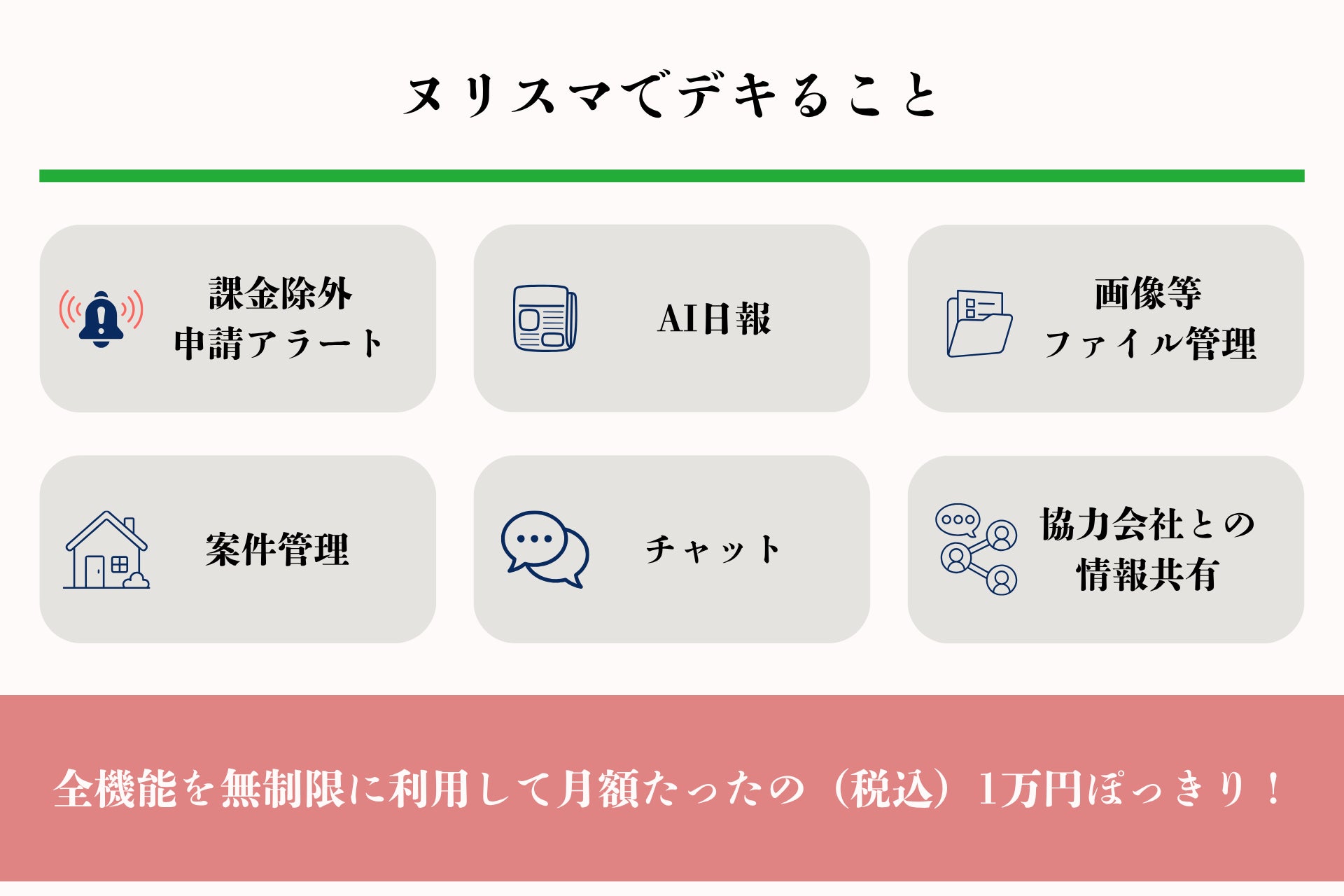 主要ポータル4社(ヌリカエ、リショップナビ、外壁塗装の窓口、ヌリマッチ)からのメールを自動読み込み&自動登録 。申請期限が近づくとヌリスマが自動でアラートを通知します 。この「課金除外申請アラート機能」は現場管理アプリ業界で唯一無二の機能。月に1件でも課金除外申請漏れを防ぐことができれば、2万円弱の無駄なコストの削減に繋がります。つまりヌリスマの月額費用の税込1万円(日当たり323円)は回収可能です 。コストではなく「利益を守る」ための投資を、今すぐ始めましょう。