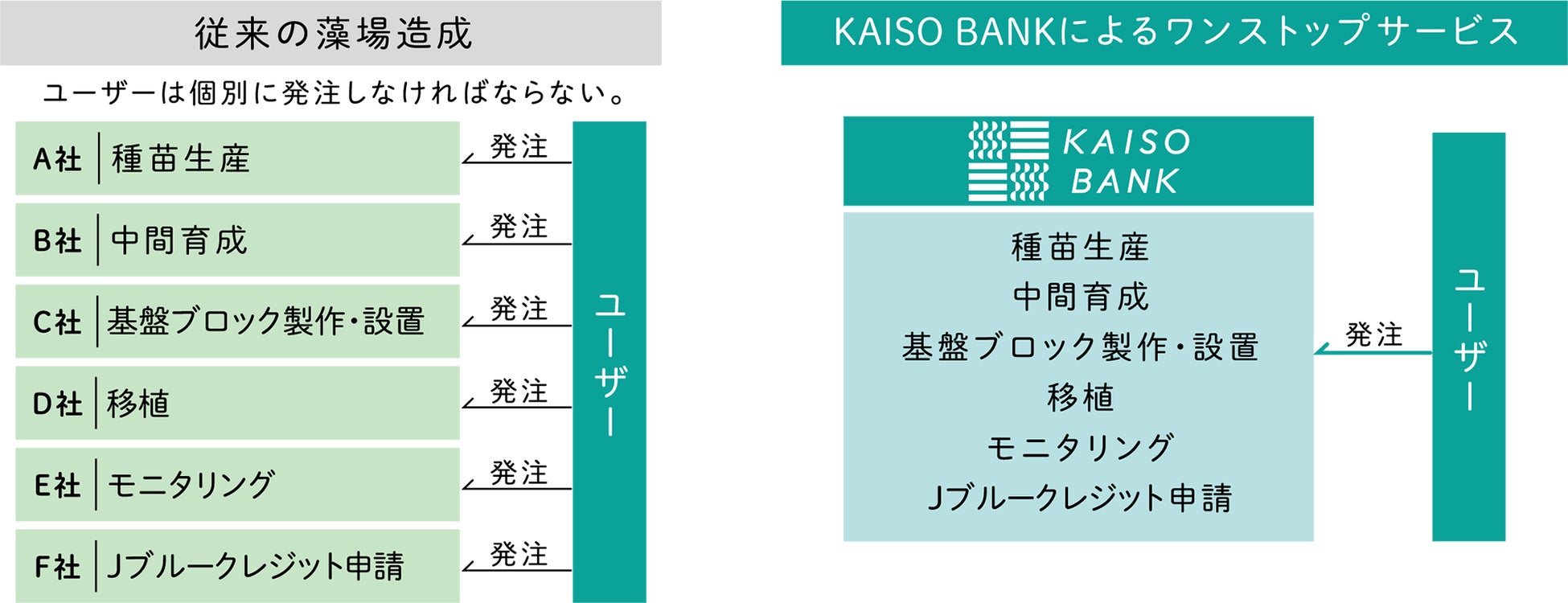 KAISO BANKコンソーシアムとして包括的に対応可能であるため、種苗生産からJブルークレジット®申請までワンストップサービスを開発・構築し、普及を目指します。