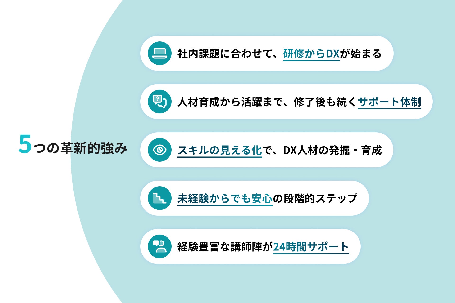 研修中から実際のDXプロジェクトが始動する設計となっており、動画視聴中心の他社研修(自学自習型)と比較して、現場で成果が出やすい点が大きな強みです。
