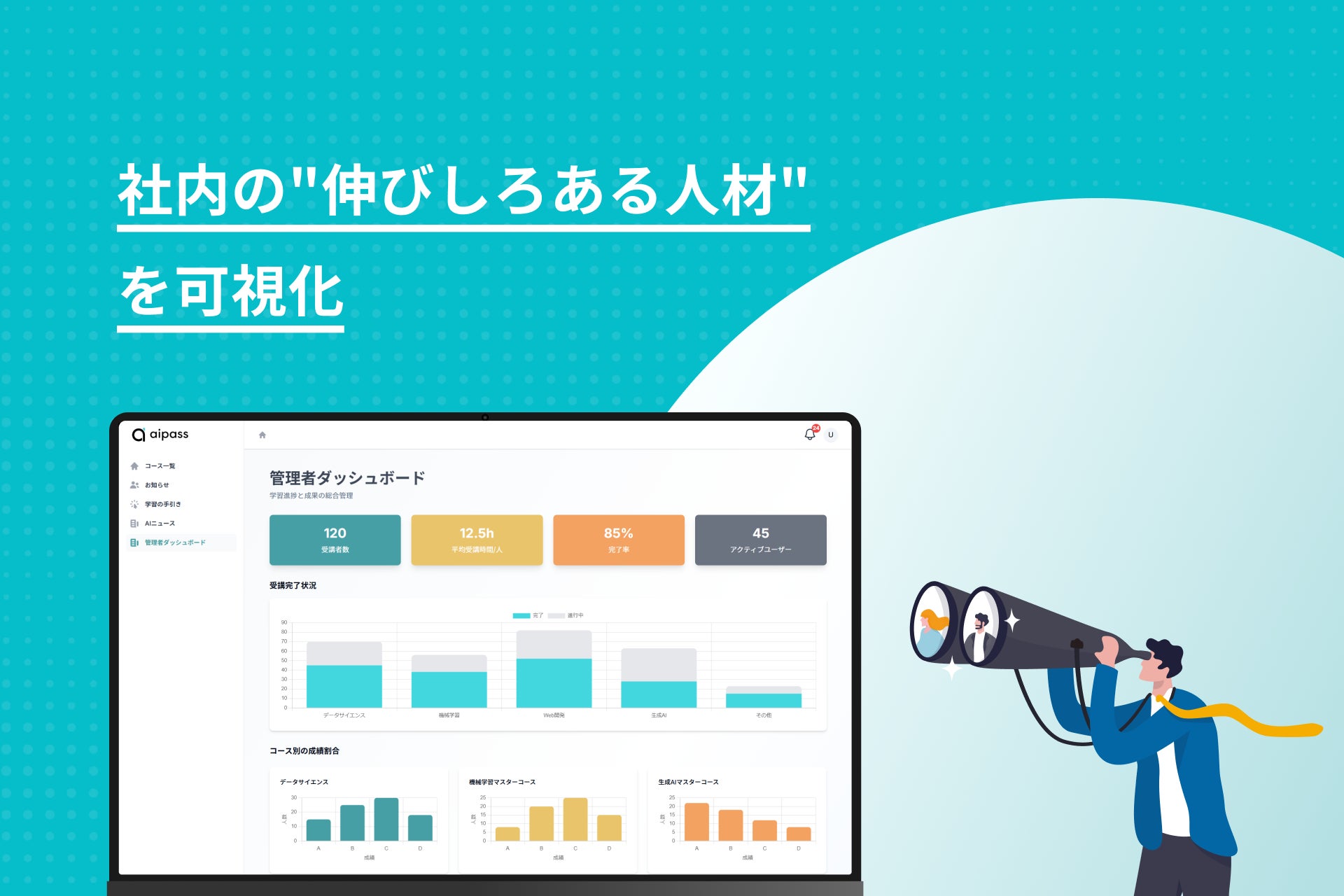 未経験から最短3ヶ月で即戦力AI人材を育成。ダッシュボードで進捗と成果を見える化し、修了後も継続サポートでDX実現まで伴走