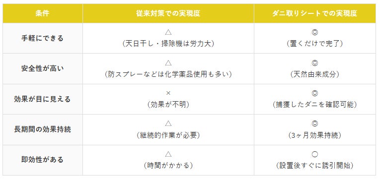 本記事で実践した500名への調査により、「手軽さ」「安全性」「効果の可視化」という3つの要素を満たす効果的で継続可能なダニ対策として「ダニ取りシート」が最も理想的な条件を満たしていることが明らかになりました。