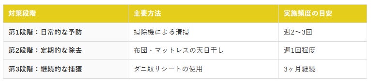 効果実感上位3つの対策(天日干し・掃除機・ダニ取りシート)は、それぞれ異なるアプローチでダニ問題にアプローチしており、予防・除去・誘引捕獲という包括的な対策体系を構築しています。