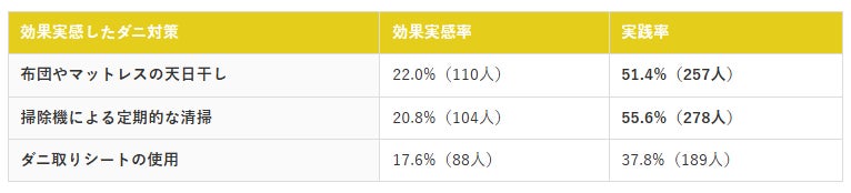 最も効果があると感じているダニ対策について調査した結果、『布団やマットレスの天日干し』が22.0%(110人)で最も高い効果実感を得ていることが分かりました。