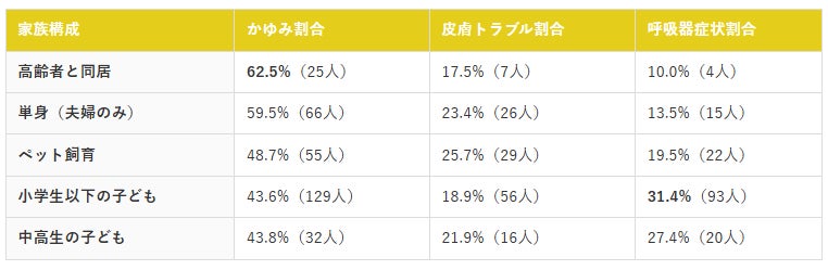 最も「かゆみ」の割合が高いのは高齢者同居世帯となっている一方、子どものいる世帯では「呼吸器症状」の割合が高いことが分かります。
