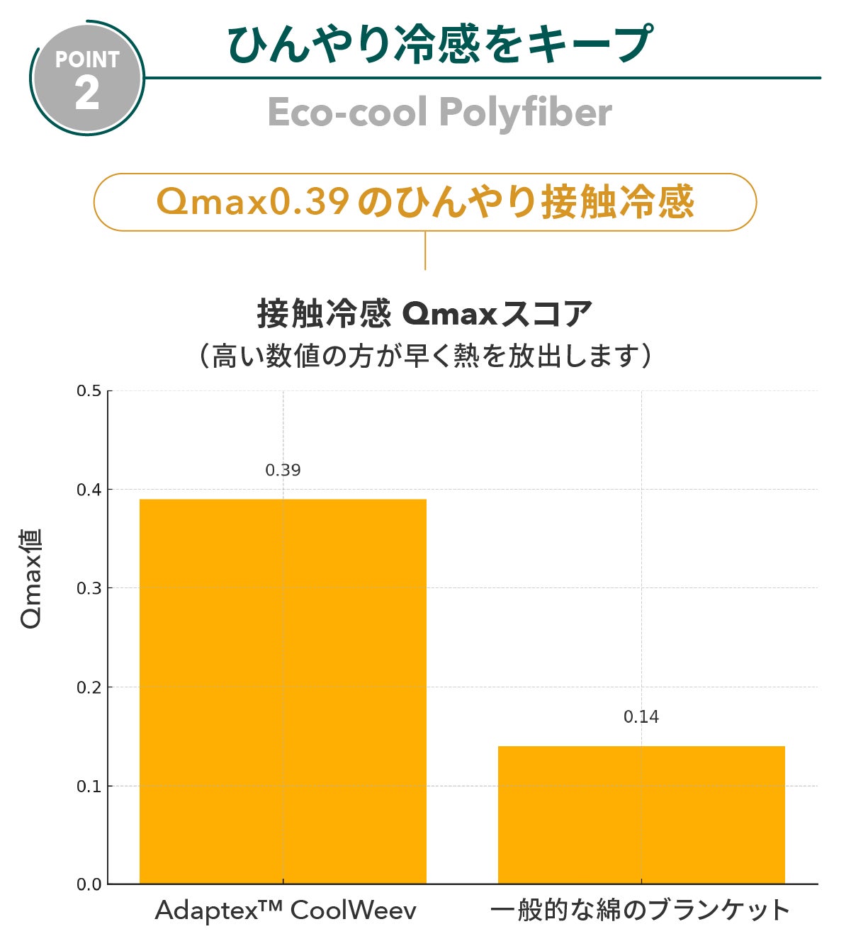 独自開発の Adaptex CoolWeev™(特許出願中)により、綿素材の約3倍の速さで熱を放出。Qmax試験で 0.39 の高い冷感値を記録しました(綿は約 0.14)。肌に触れた瞬間からしっかりクールなひんやり感が得られます。