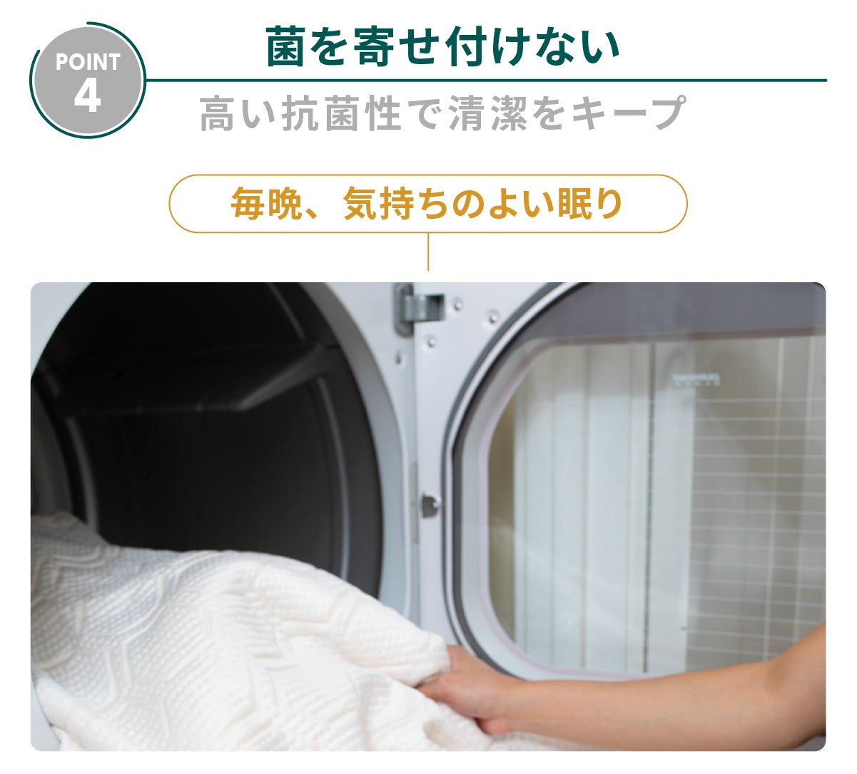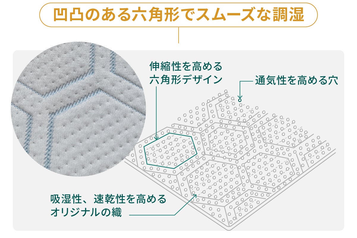 表面に設けた六角形の立体構造が、肌との間に微細な空気の層をつくり、通気性と放熱効果をアップ。この6六角形が寝返りに沿って伸び曲がり快適な寝心地。サラっと快適な感触が朝まで続きます。