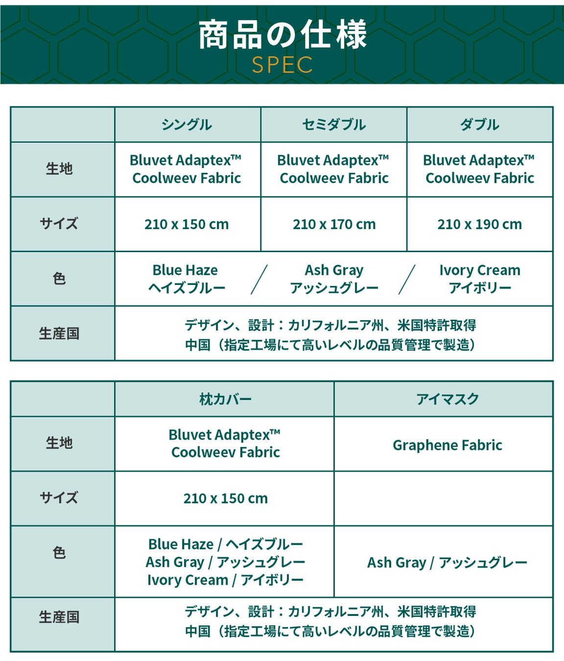 HILU Bluvet(ヒル・ブルベット)は、独自開発のAdaptex CoolWeev™生地を使い、繊維テクノロジーの力で布団内の熱・湿気を効率よく逃がし、調湿をサポートします。春夏は冷感ブランケット、秋冬は掛布団カバー、敷パッドとして1年を通じて使える3WAY仕様を採用しています。OEKO-TEX認証&10年品質保証で安心してお使いいただけるブランケットです。