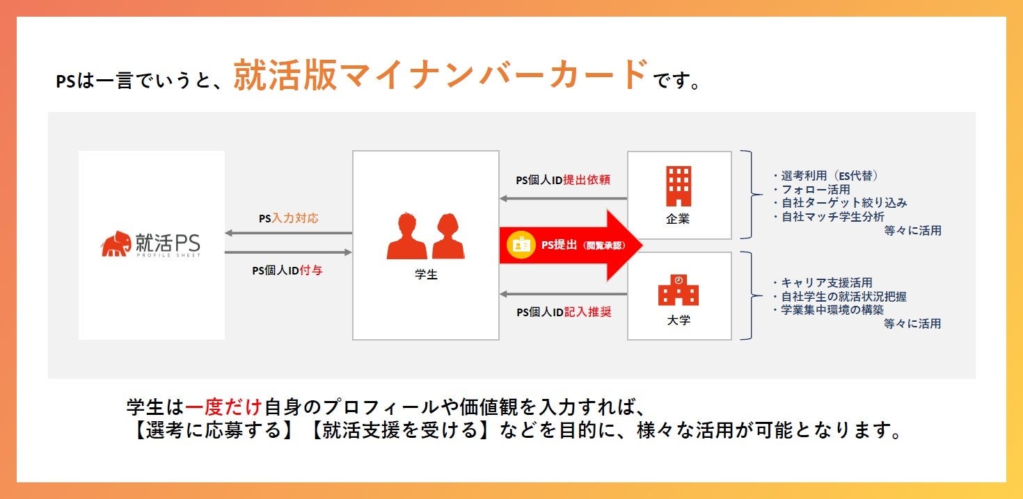 就活プロフィールシート(以下PS)は、学生の【学歴】【人生経験】【実績】【価値観】などのパーソナルレコード(これまでの人生の歩み)が一元的に記録・管理され、企業が共同で活用する学生データベースです。就職活動におけるイベント参加やOBOG訪問、選考応募の際などに学生が企業へ提出(閲覧承認)することで、企業がより深く、正確に学生を理解するためのツールです。