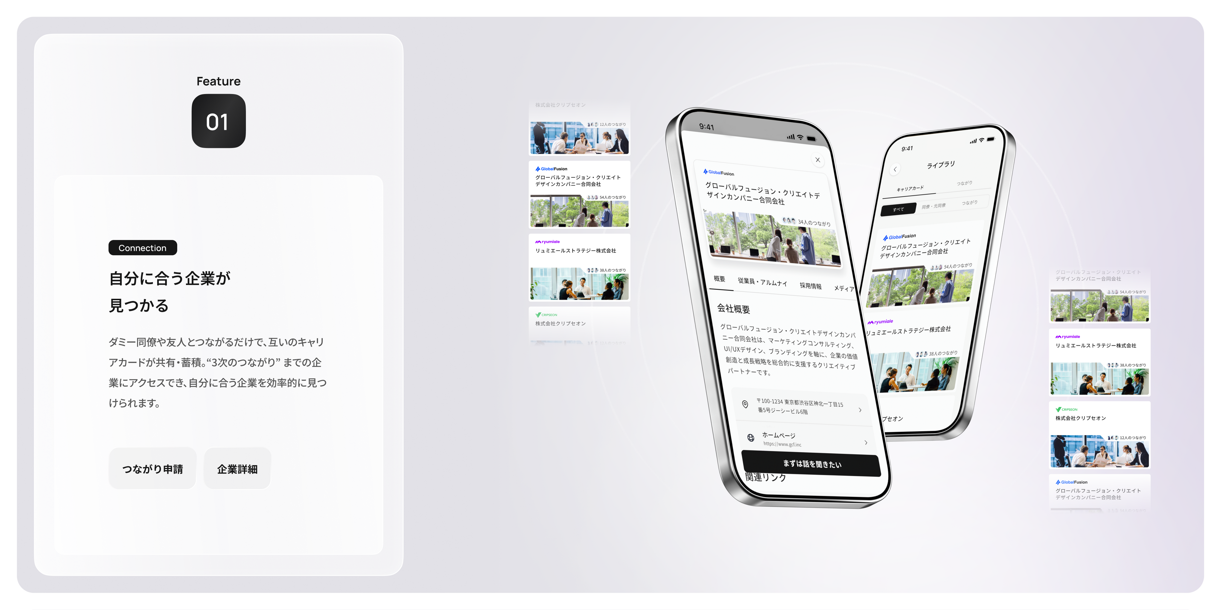 あなたの経歴に応じてキャリアカードを発行。周りの友人・知人・家族とつながるだけで、互いのキャリアカード(転職先候補)を共有・蓄積。