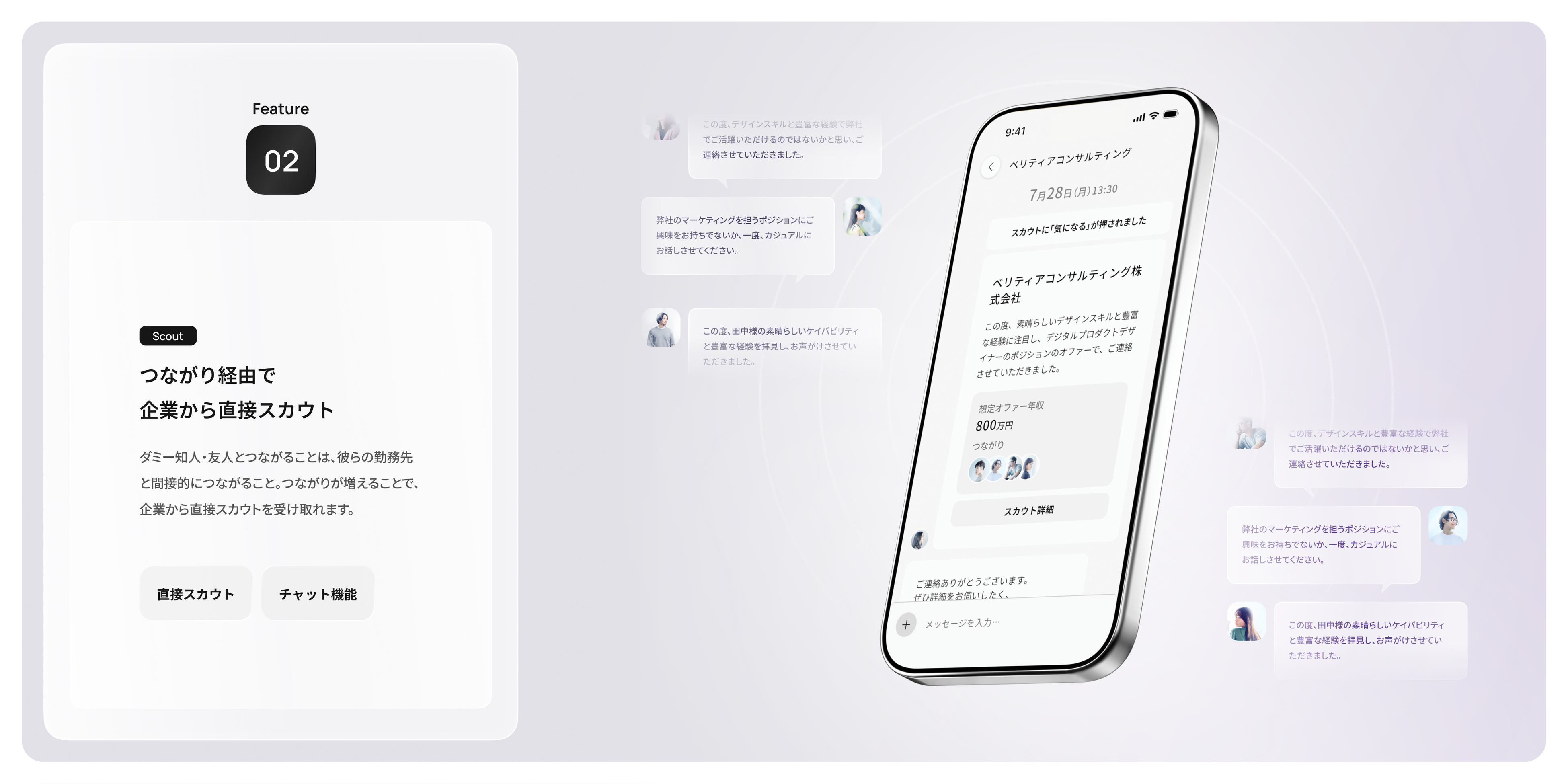 キャリアカードを持つということは、あなたをつながり経由で認知する会社が増えるということ。職務経歴書、履歴書だけでは伝わらない、あなたの良さを知っている企業から直接スカウトを受け取れる。