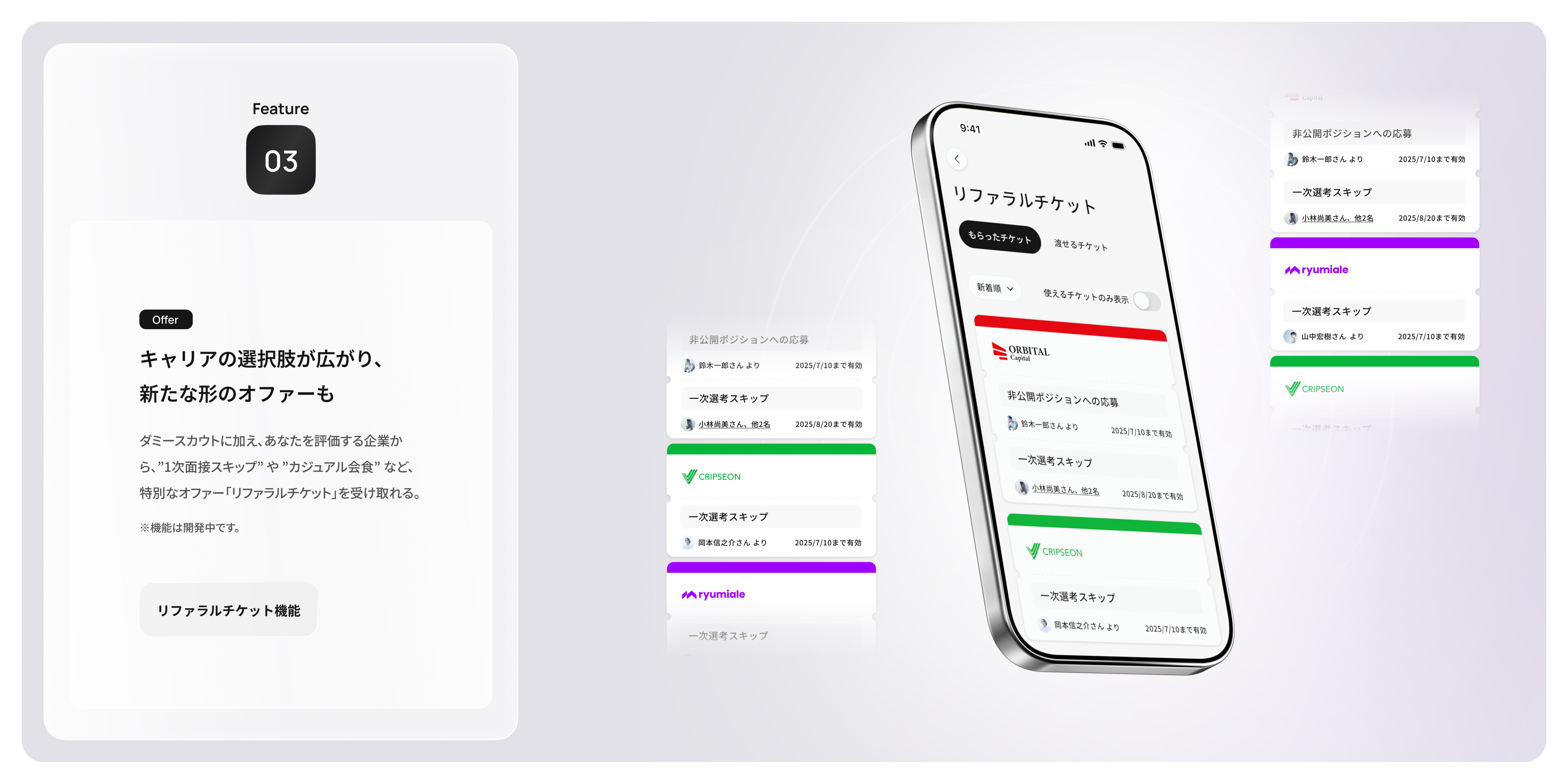 スカウトに加え、あなたに興味がある企業から、“書類選考スキップ” や “カジュアル会食” など、特別なオファー「リファラルチケット」を受け取れる。