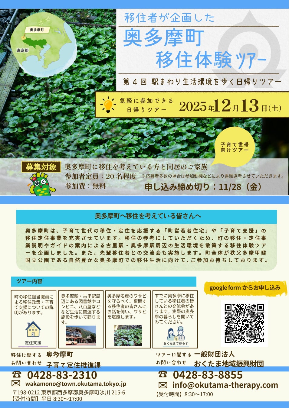 奥多摩町では、少子高齢化などにより人口減少が進んでいます。人口の流出防止と若年夫婦世帯などを対象とした転入増加を図るため、移住定住していただけるような様々な少子化・定住化対策を展開しています。今回は奥多摩町に移住定住をお考えの方、興味のある方を対象に移住体験ツアーを実施いたします。奥多摩町での生活実態として、買い物はどうしている?病院は?学校や保育園は?町営住宅はどのような感じ?などなど、移住を考える材料としていただけるようなツアーを企画してみました。