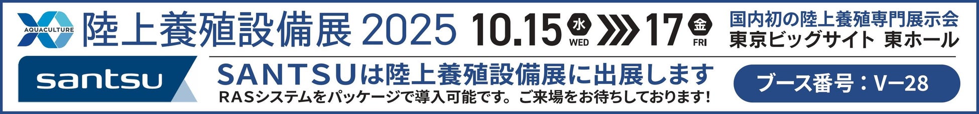 株式会社SANTSU(本社:東京都中央区、代表取締役社長:李 振生、以下SANTSU)は、2025年10月15日(水)~17日(金)に東京ビッグサイト東ホールで開催される「陸上養殖設備展2025」に出展します。SANTSUは、中国・莱州明波水産および三通生物工程と共同で、「持続可能な水産養殖」の実現を目指しています。「陸上養殖設備展2025」では、最新の水質管理・自動化技術・RAS養殖システムを実機展示し、業界の新たな可能性を紹介します。