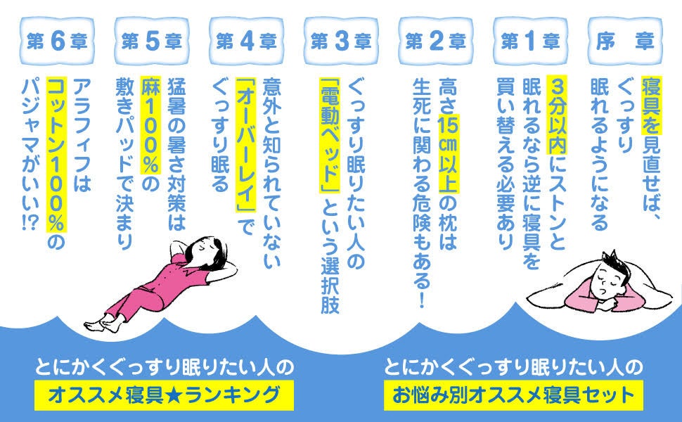 そこで、2009年から続けてきた快眠ビジネスで培ったノウハウをもっと世の中に知ってもらいたいと出版を決意。睡眠の資格を持つ医師とタッグを組み、寝具から睡眠を見直す方法を惜しげもなく載せました。