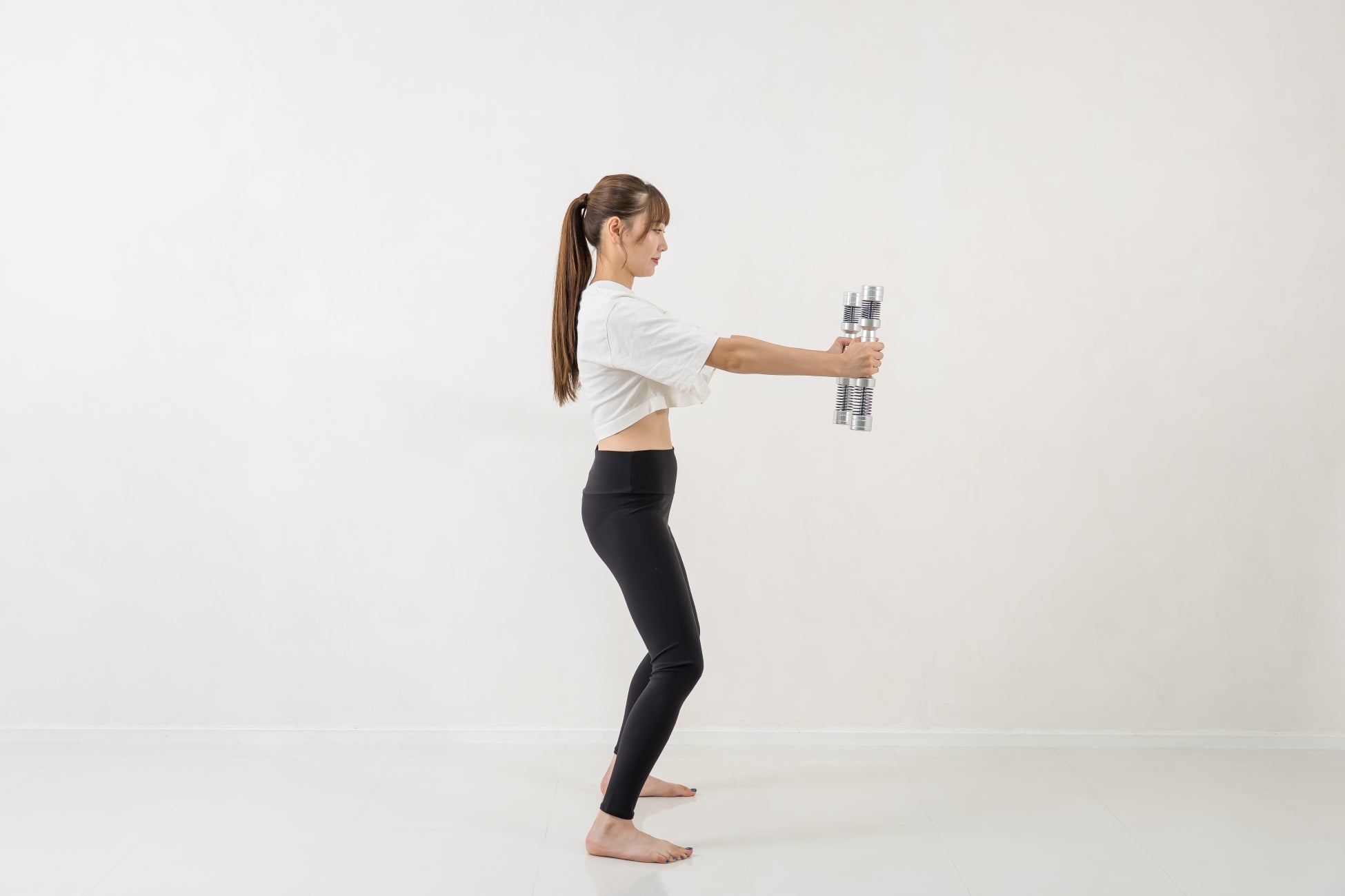•やり方:腕を前に伸ばして振ることで、上半身の引き締めと姿勢改善をサポート