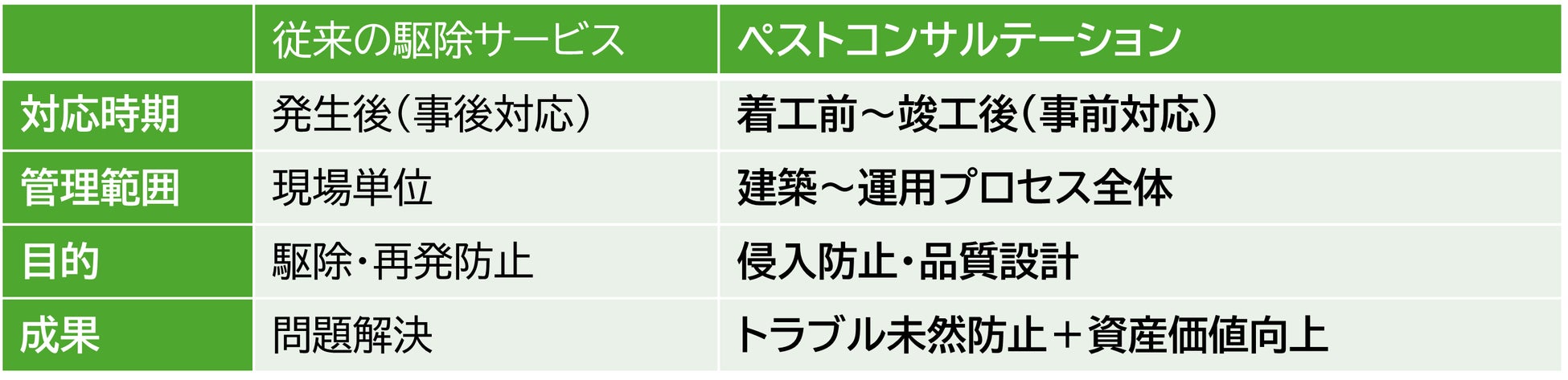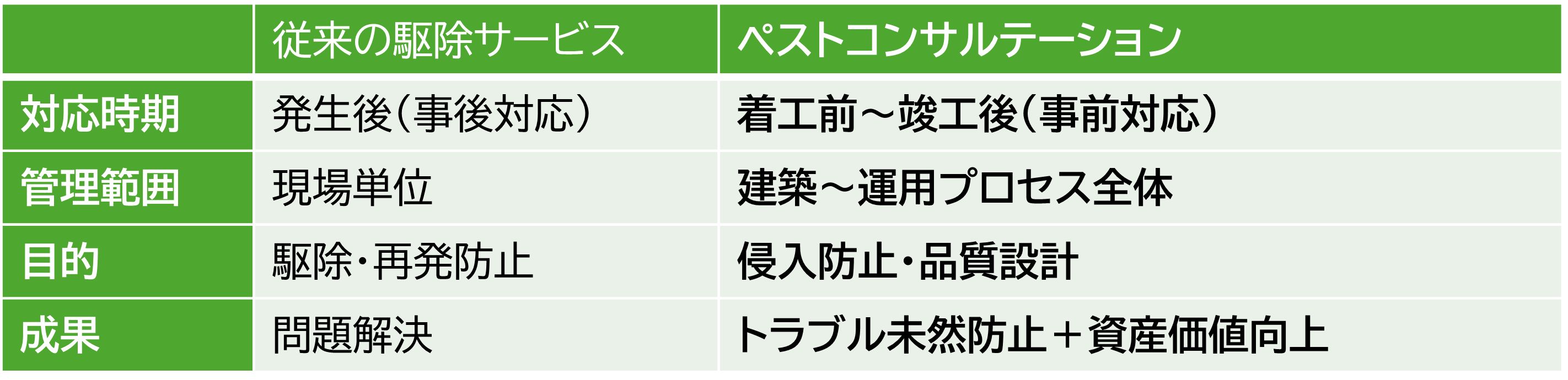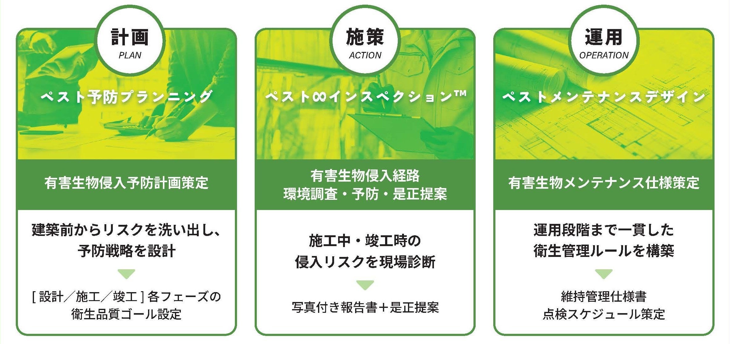 単なる害虫駆除にとどまらない、竣工後のメンテナンス軽減、設計・工事の付加価値向上、環境配慮型施設づくりの一助といった効果を同時に実現することを目指しています。