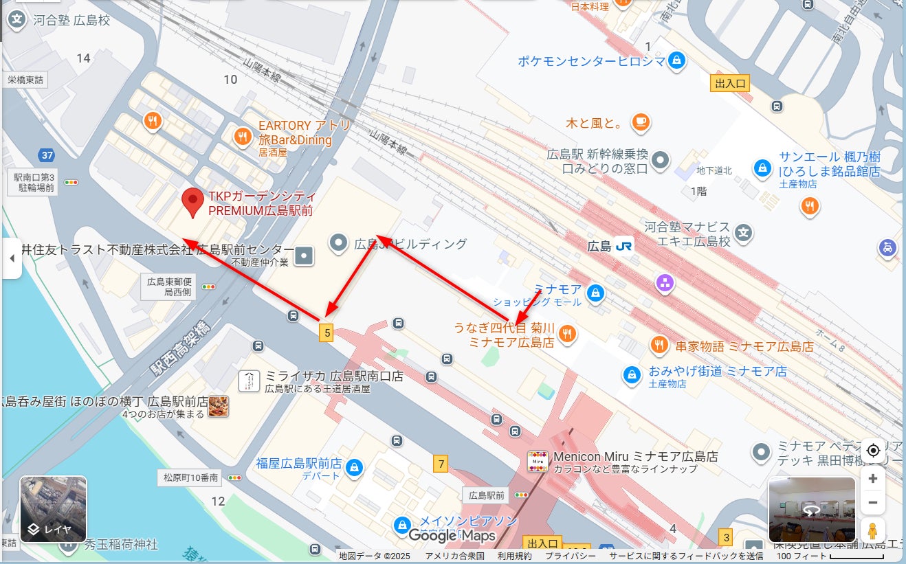 JRでお越しの方は、ミナモア改札を出て→ペデストリアンデッキを通り→西隣の広島JPビルディング→地上に下りて、TKPまでお越しいただくとスムーズです。