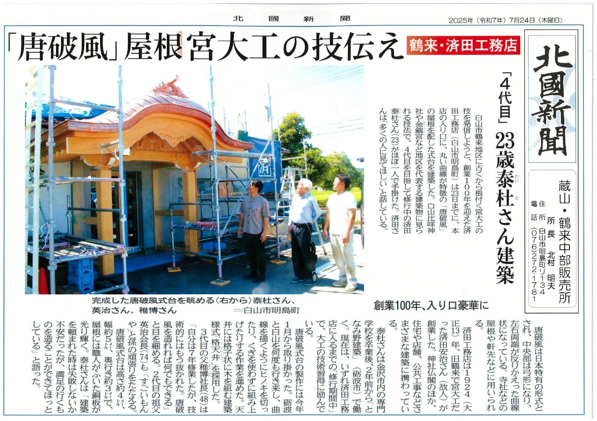 3代目の父稚博社長(48)は「自分は7年修行したが、技術的にはもう抜かれた。唐破風を造れれば何でもできる」と目を細める。2代目の祖父英治会長(74)も「すごいもんや」と孫の頑張りをたたえる。唐破風式台は高さ約4メートル、幅約5メートル、高さ3メートルで、屋根には職人がふいた銅板が光り輝く。泰杜は「建築を依頼された時は、失敗しないか不安だったが、満足のいくものを造ることができてほっとしている」と語った。今後の事業拡大と地域貢献を目的として様々なプロジェクトを考案している。