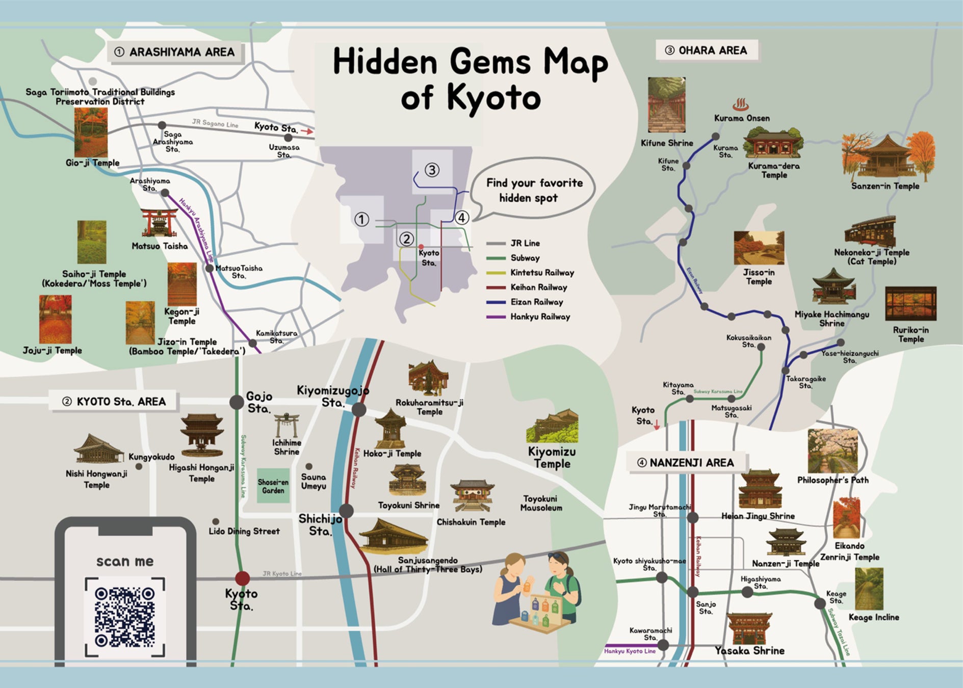 嵐山・京都駅・大原・南禅寺の4エリアの知られざるスポットを紹介します。QRコードを読み込むことで、スマホ上でMAPを見ることができます。