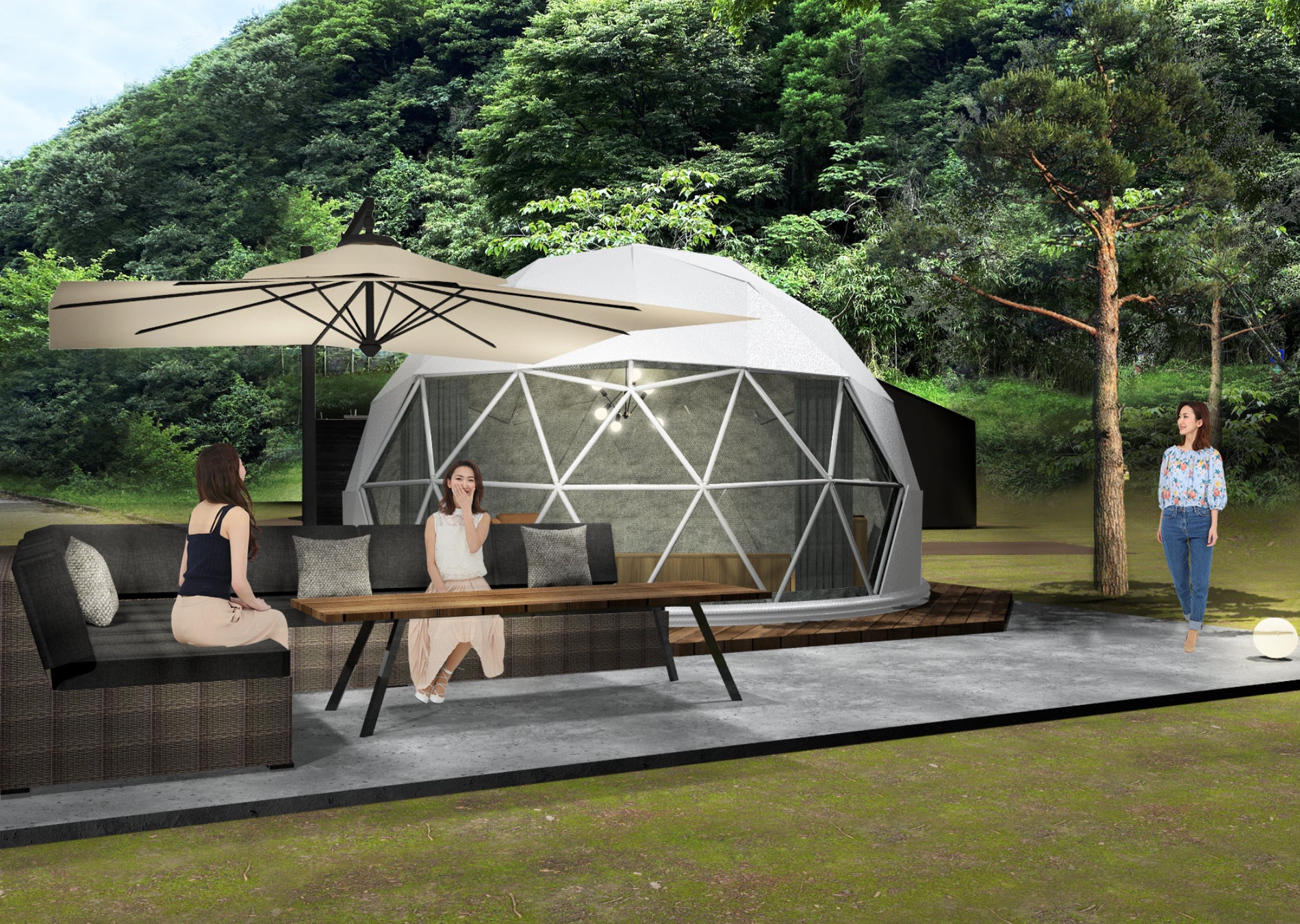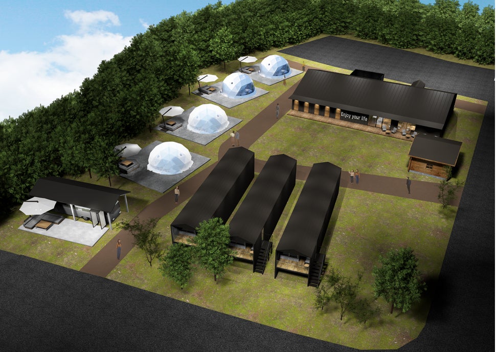 • グランピング棟(4棟・各100㎡):広々としたドーム型テント+専用サニタリー