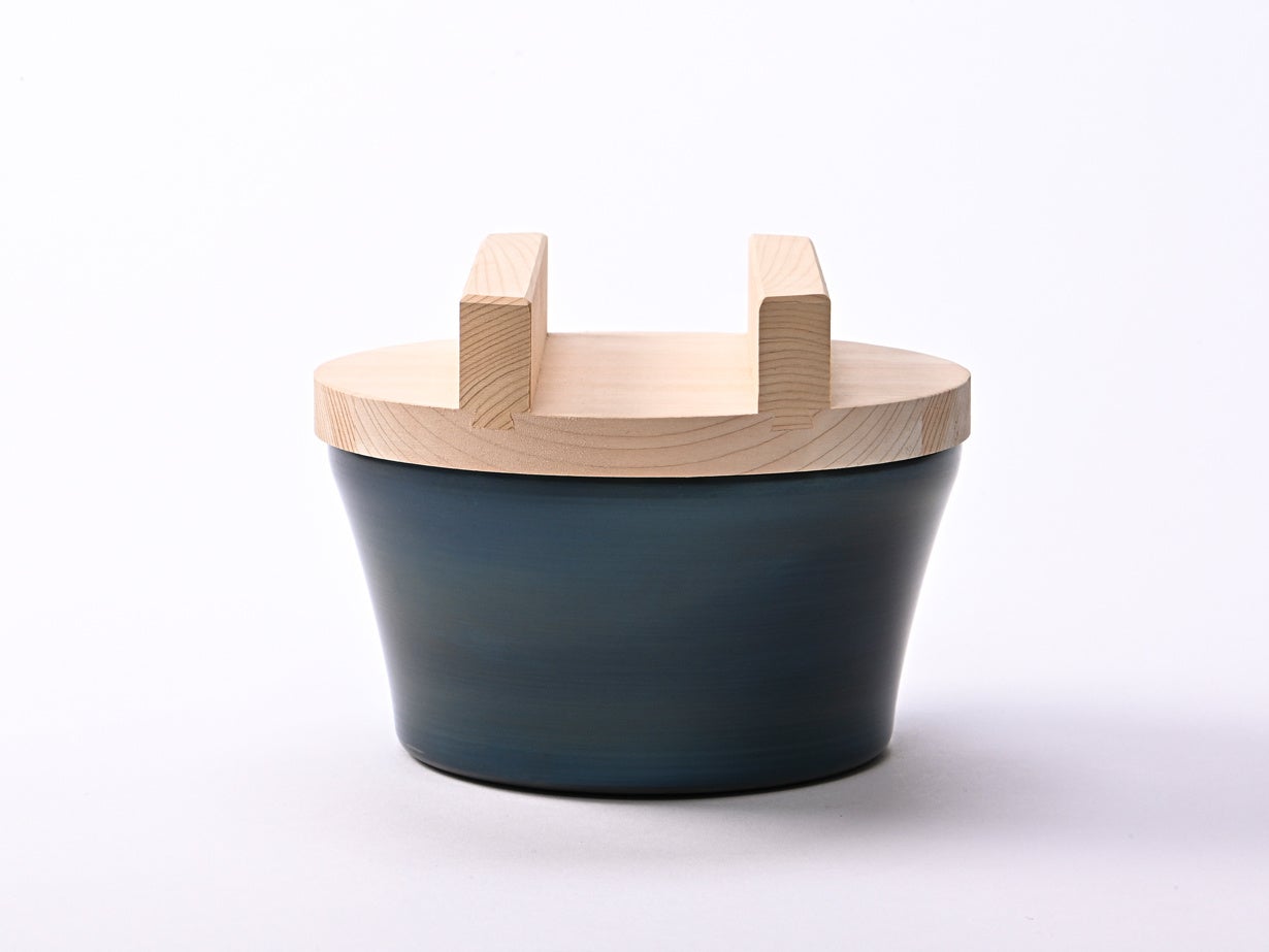 蓋には、昔ながらの二本取っ手をあしらった木蓋を採用。鉄鍋の重厚感が調和し、伝統とモダンが融合するデザインです。