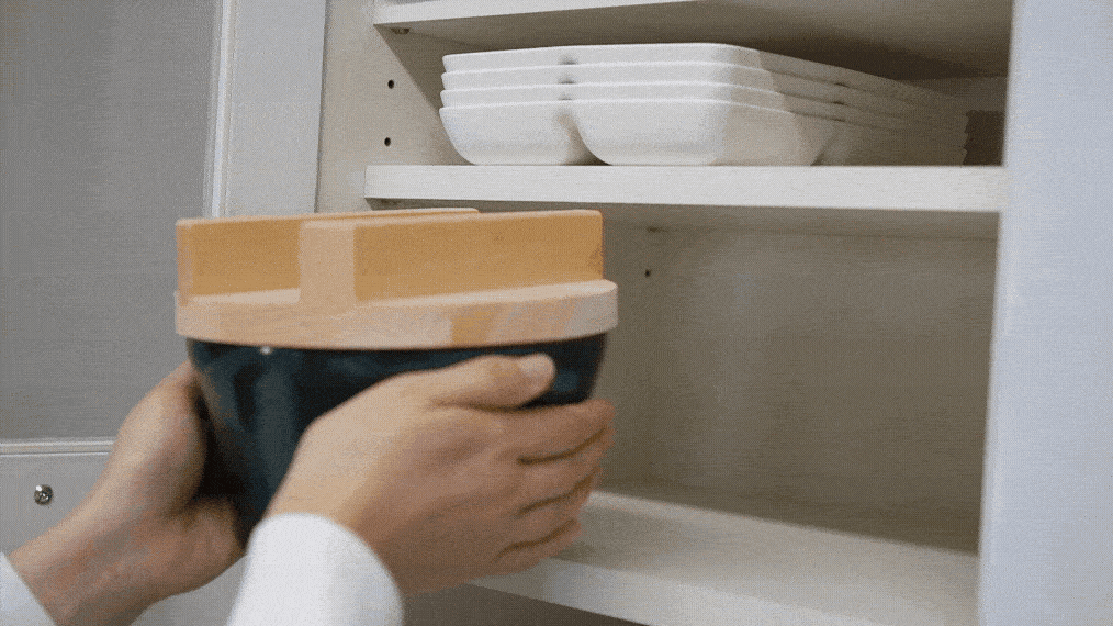 「お米炊くパン」は、現代の暮らしに合った新しいフォルムを実現。外側に向かう緩やかな曲線が、従来の炊飯窯とは異なる柔らかな印象を食卓に与えます。