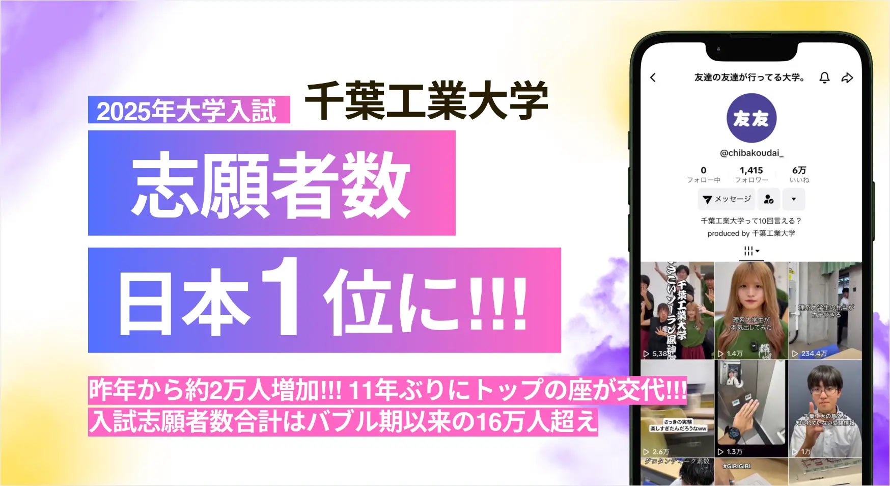 2025年度の一般入試において志願者数が前年より約2万人増加し、志願者数が16万人と私立大学において日本一となった千葉工業大学では、虹と満月と株式会社が中心となりSNSアカウントによる企画・撮影・編集・投稿分析を行い、独自の切り口の「ニッチな理系コンテンツ」で230万再生を記録しました。