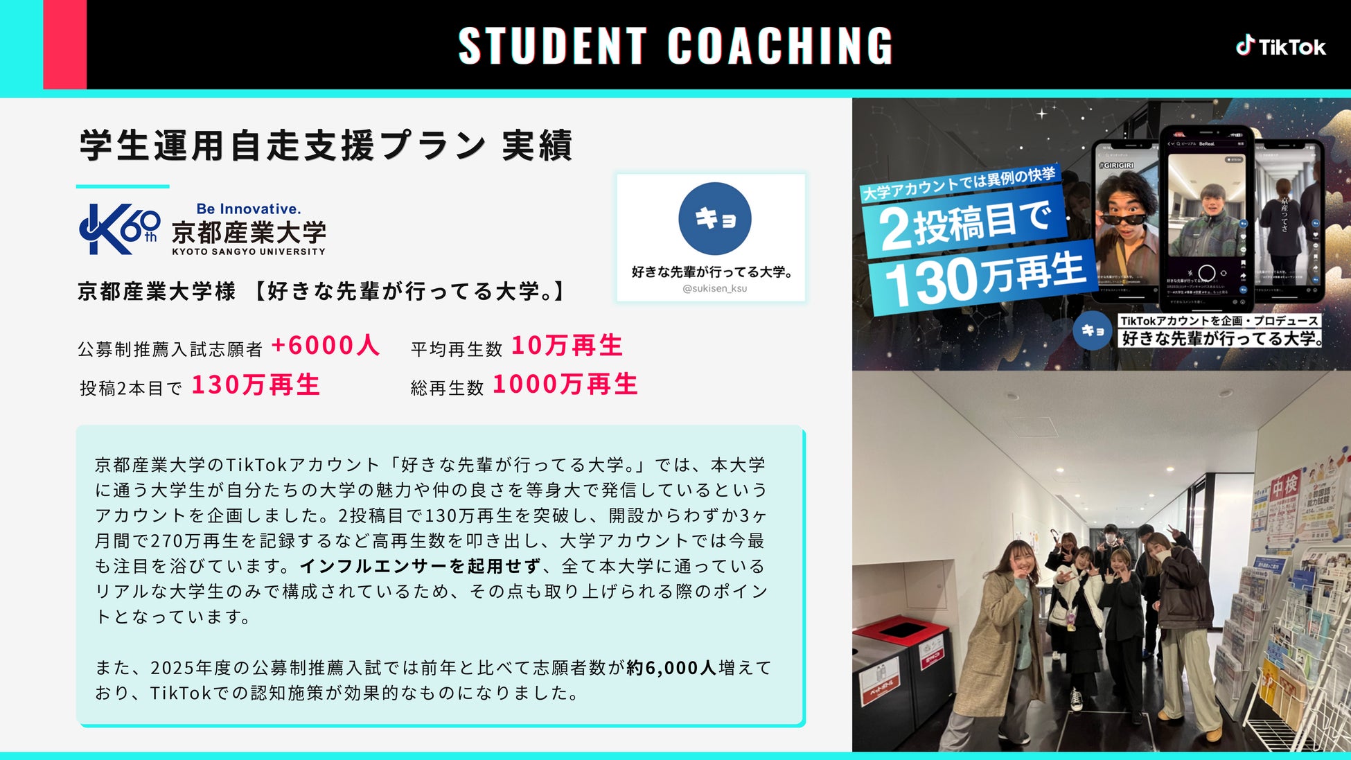” 数字にも表れていて、特に大きかったのは今年の新入生への効果です。(中略)「高校生のときTikTokで京産を知って、大学を選ぶきっかけになりました」「オープンキャンパスに一度も行ってないけど、TikTokで大学の雰囲気を掴めたので志望しました」ってリアルな声が次々出てきて ”