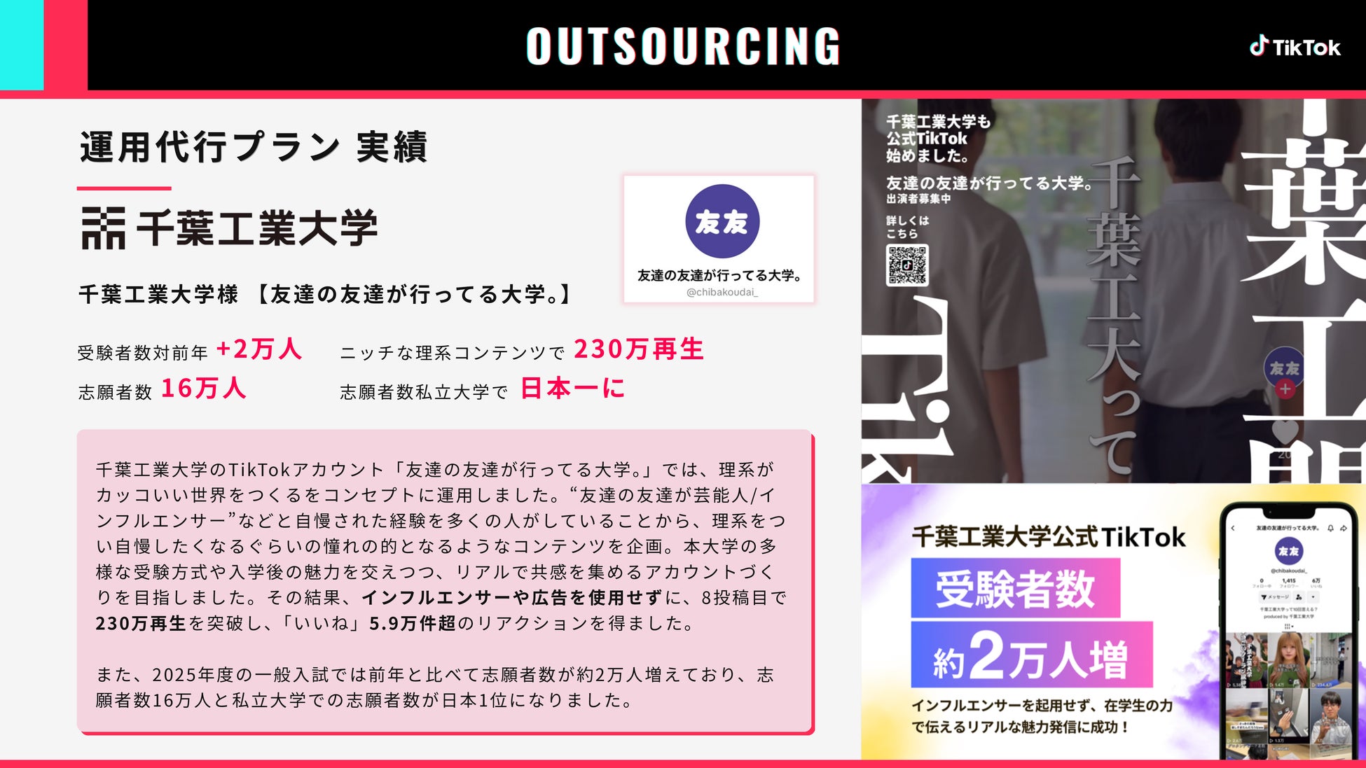 学生チームが企画・撮影・編集・投稿分析のすべてを担う体制作り・運用支援により、オーガニック投稿で総再生回数1,000万回を突破、2025年度の公募制推薦入試において前年と比べて志願者数が約6,000人増加しました。